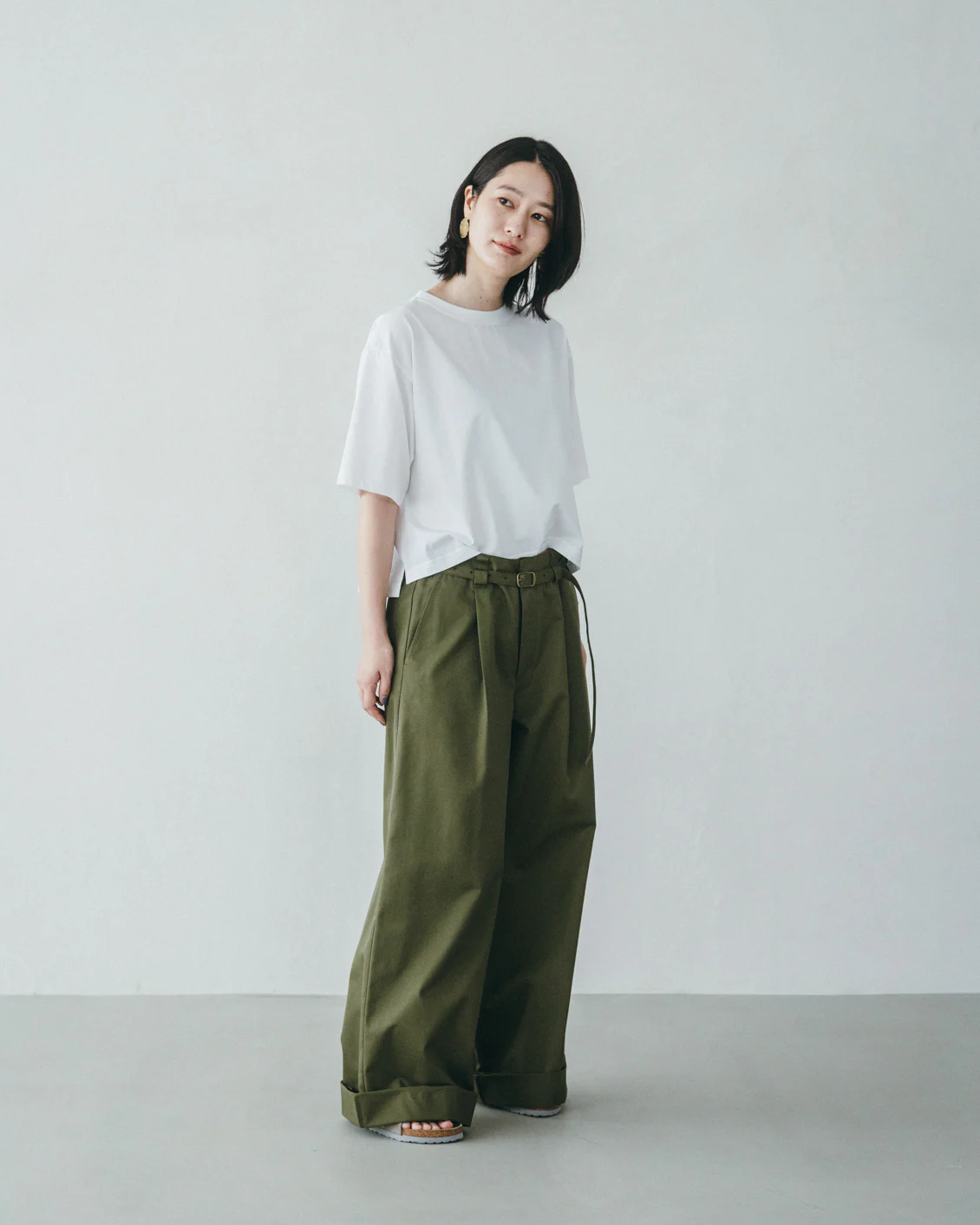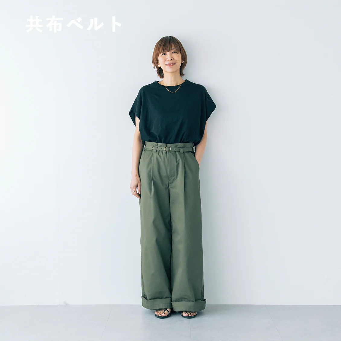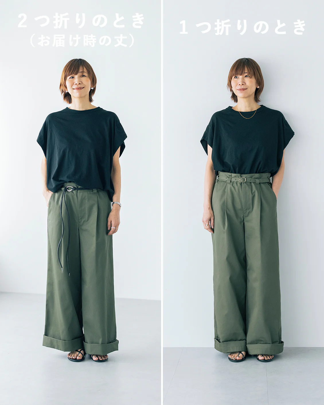 私のおすすめの合わせ方は、ぺたんこのサンダルやパンプスと合わせる時には基本の2つ折り。厚底の靴・サンダルと合わせる時には1つ折り。1つ折りの時、裾にパンツがくしゅっとたまった雰囲気も素敵だなと思います」