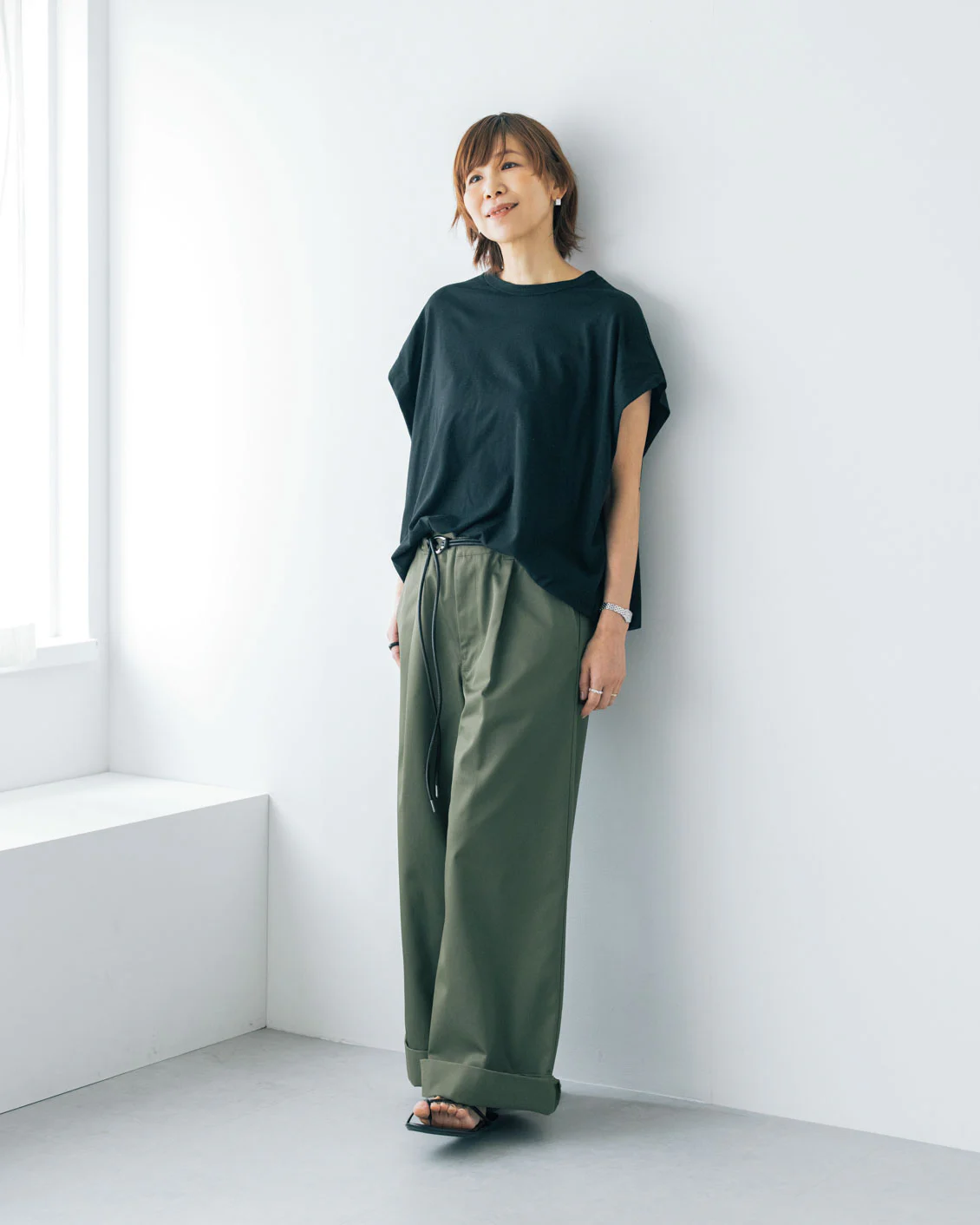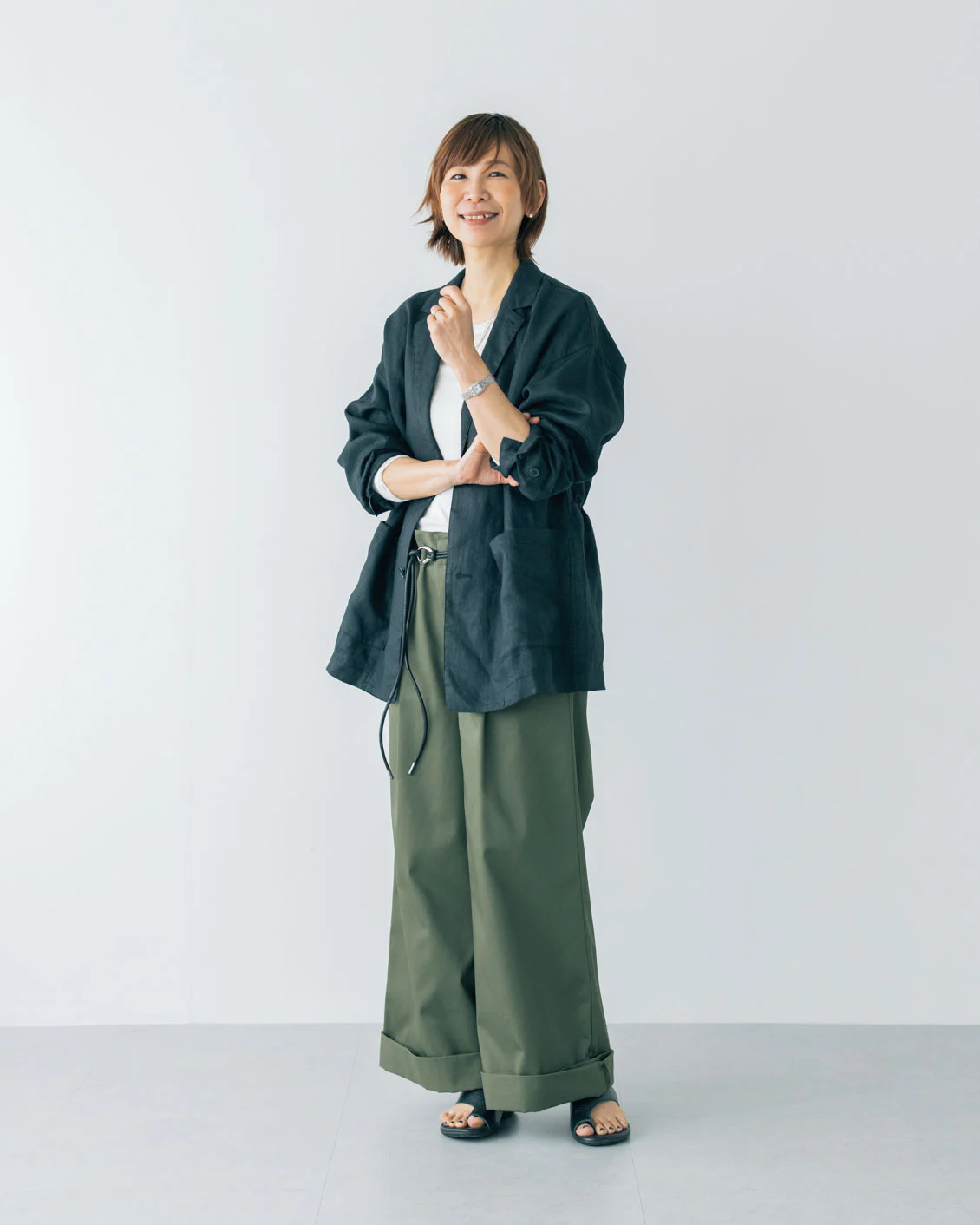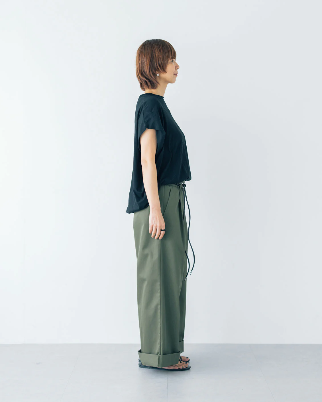 私のおすすめの合わせ方は、ぺたんこのサンダルやパンプスと合わせる時には基本の2つ折り。厚底の靴・サンダルと合わせる時には1つ折り。1つ折りの時、裾にパンツがくしゅっとたまった雰囲気も素敵だなと思います」