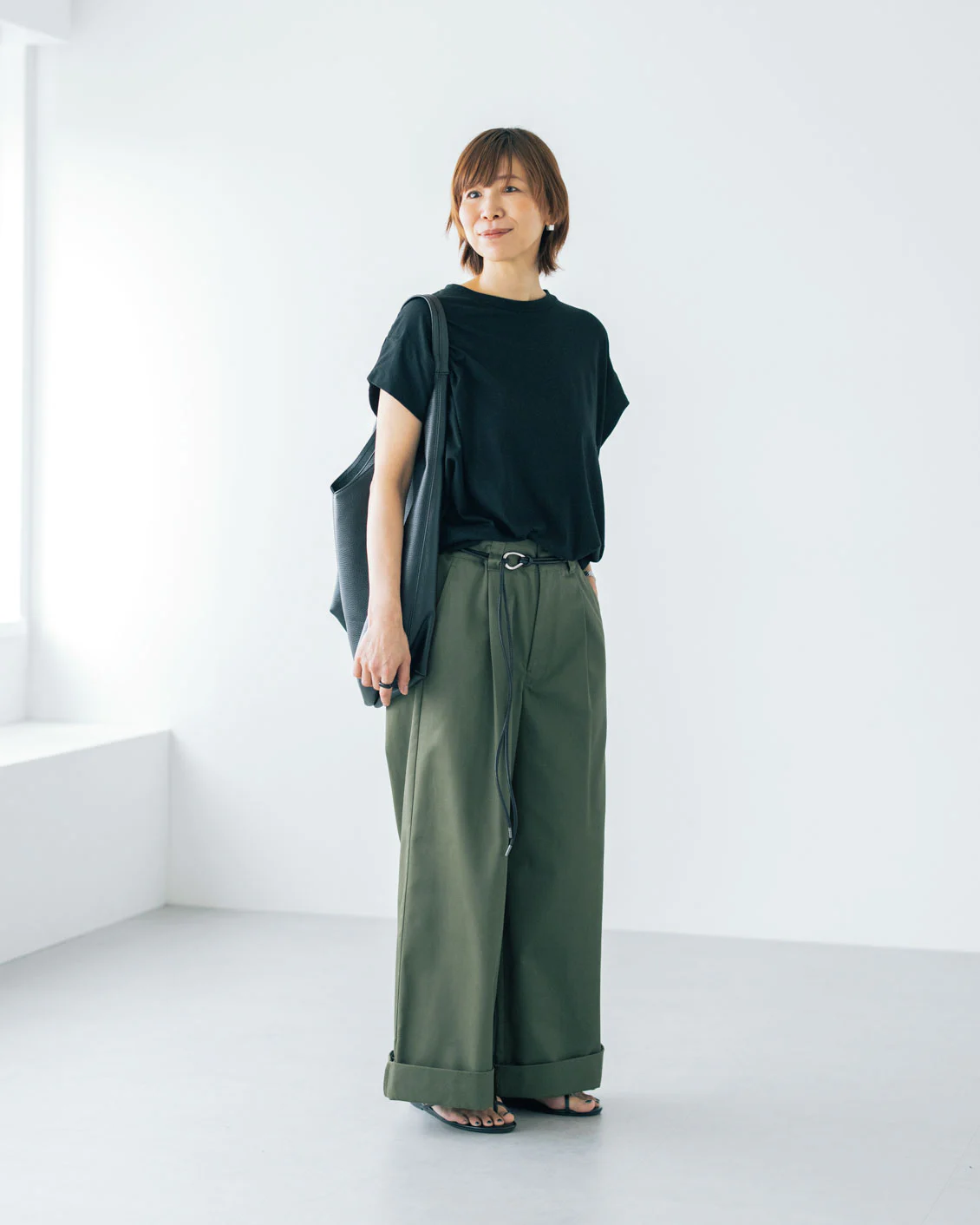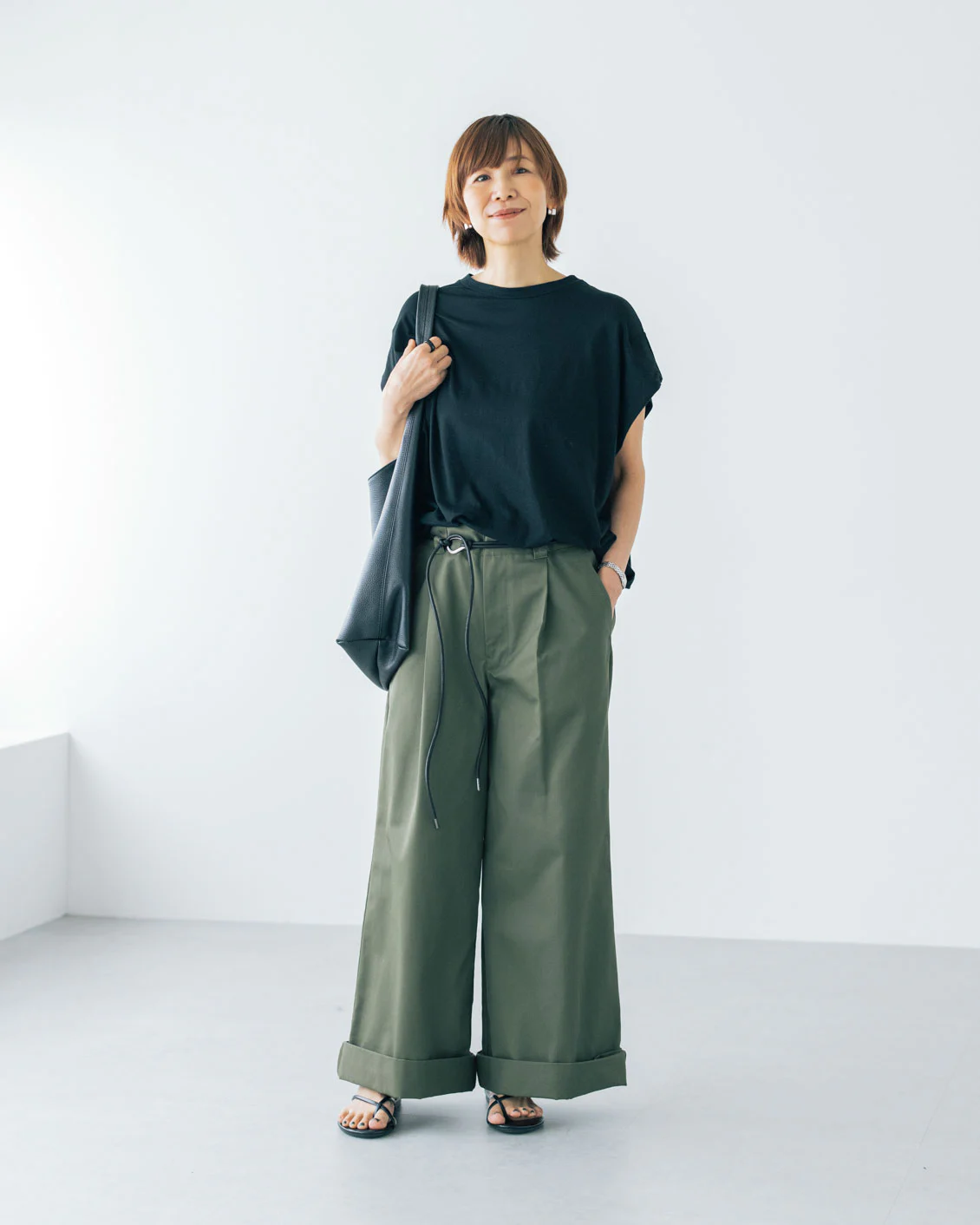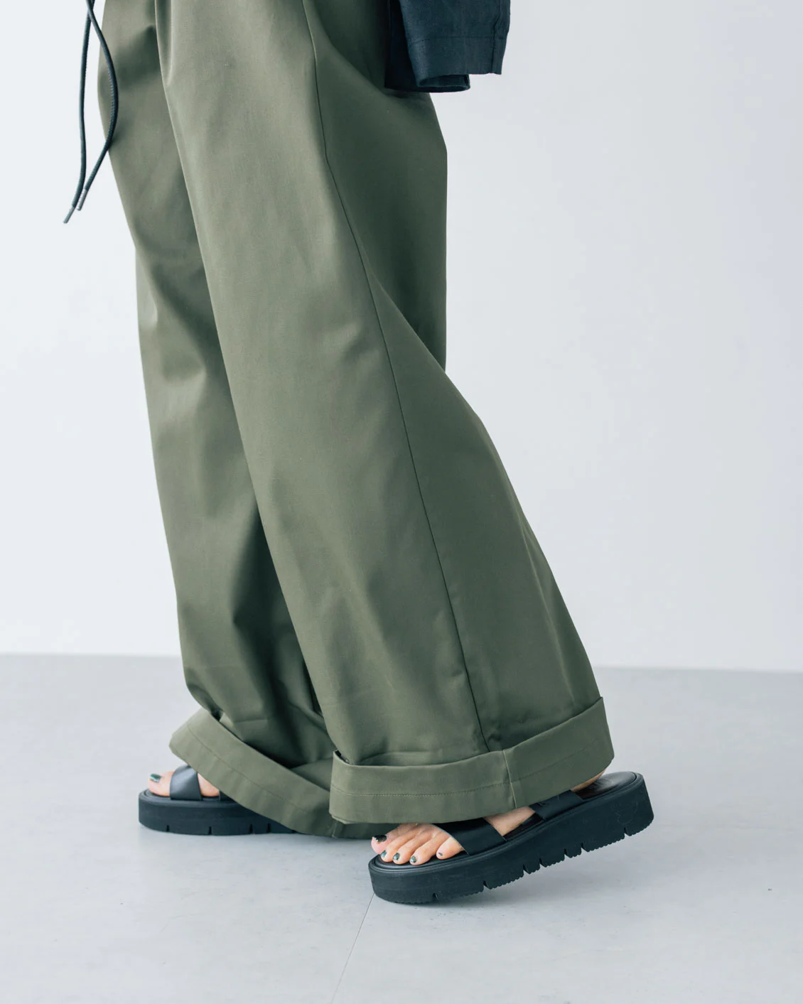 ▲ボリュームのあるサンダルとも好相性。こちらのスタイリングは、裾を1つ折りにしています