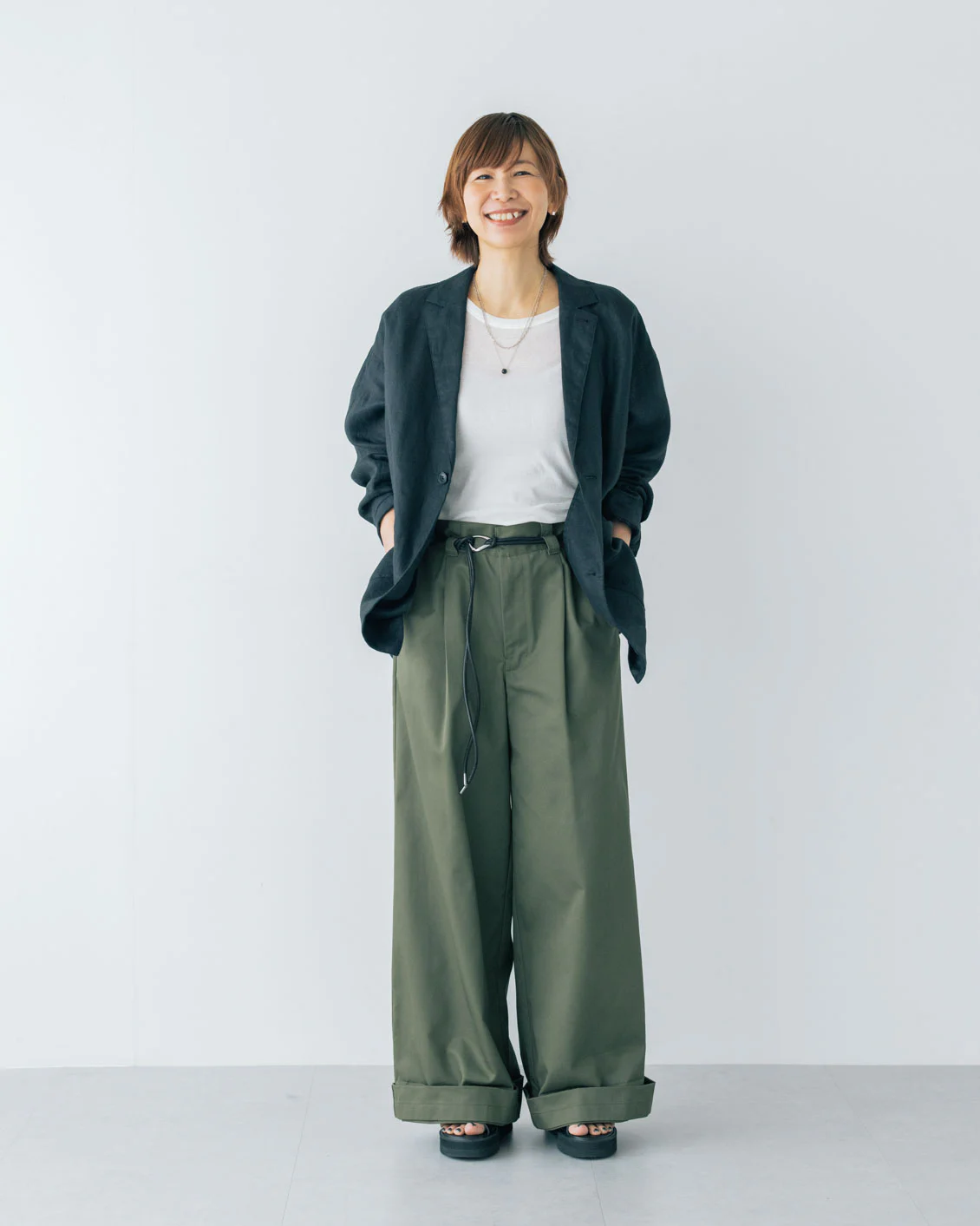 きれいめコーデのアクセントに、ロープベルト合わせもおすすめしたいです。上品さとリラックス感のバランスがちょうどいい塩梅になるかと。