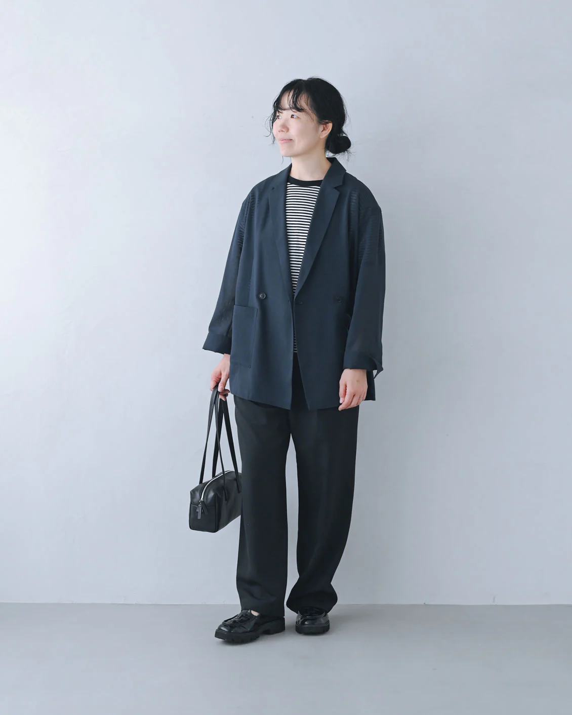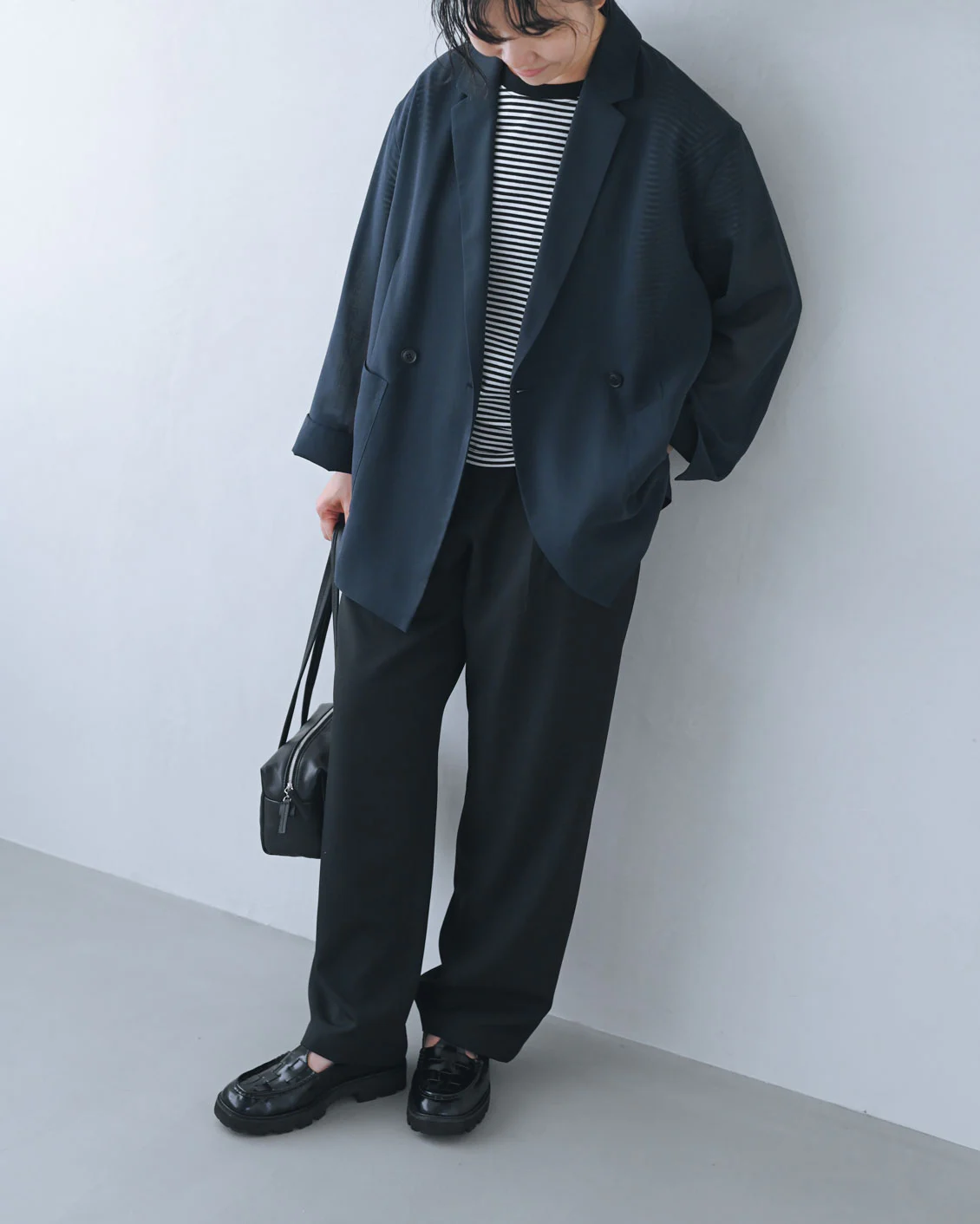 「ボーダーTシャツにシアージャケットを羽織り、スラックスにも合わせてみました。