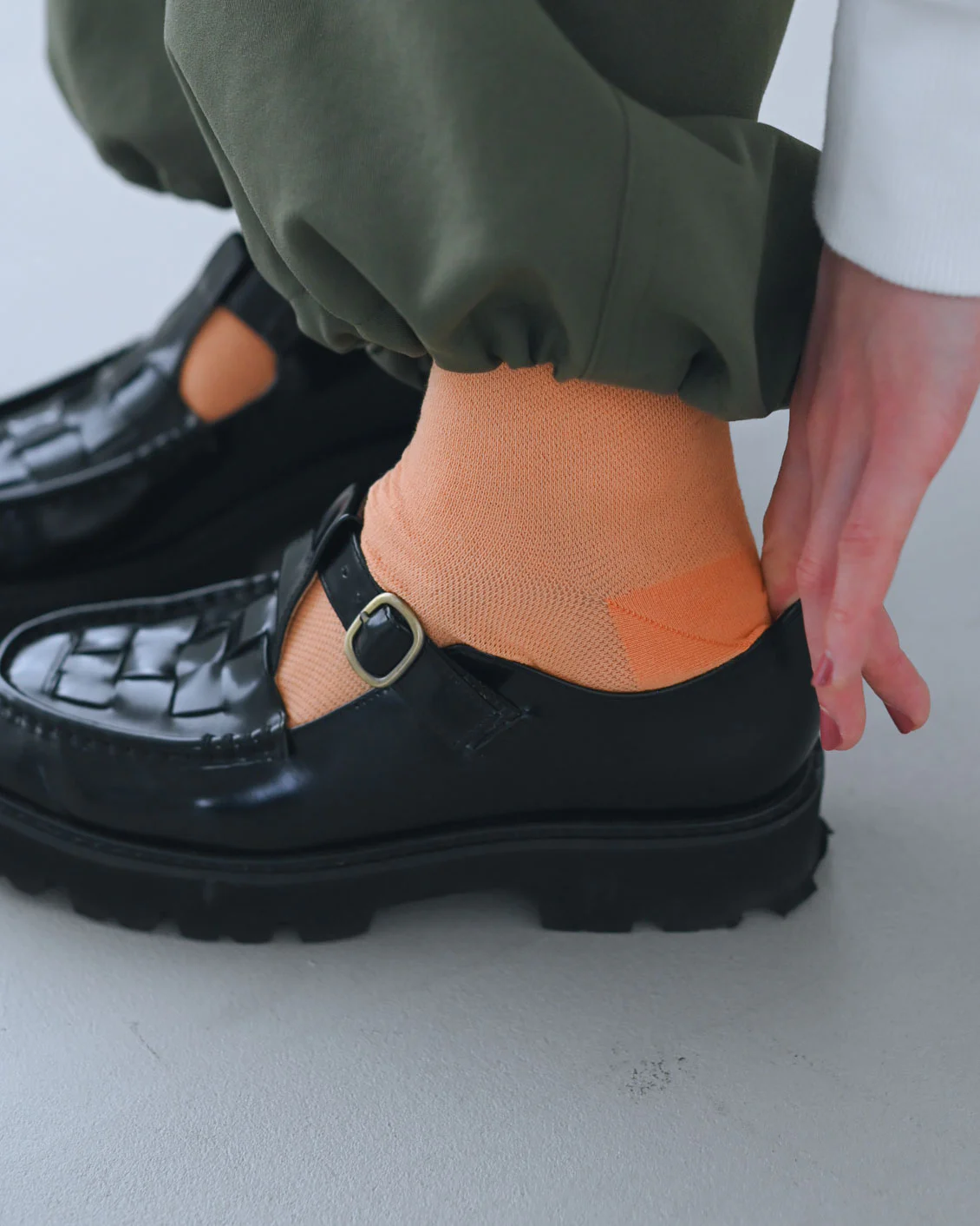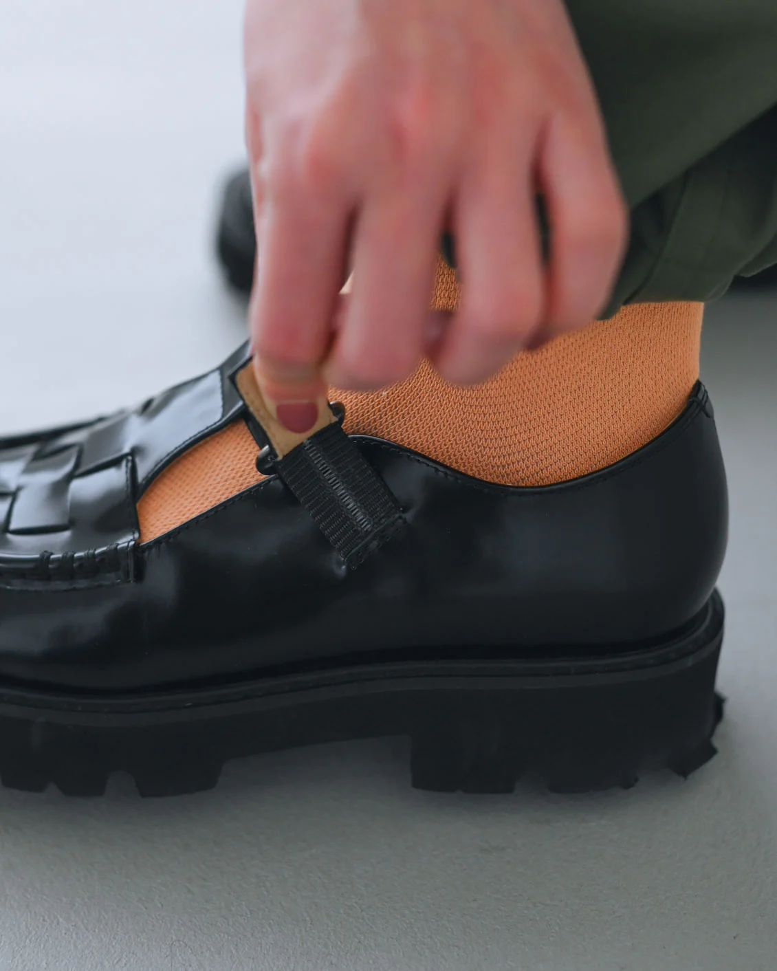 靴下はストラップの隙間からのぞくくらいなので、ぱっきりとした差し色も楽しめるのがうれしいです。今の時期は、春だし、と自分に言い訳して思いきり明るい色を取り入れたくなります。