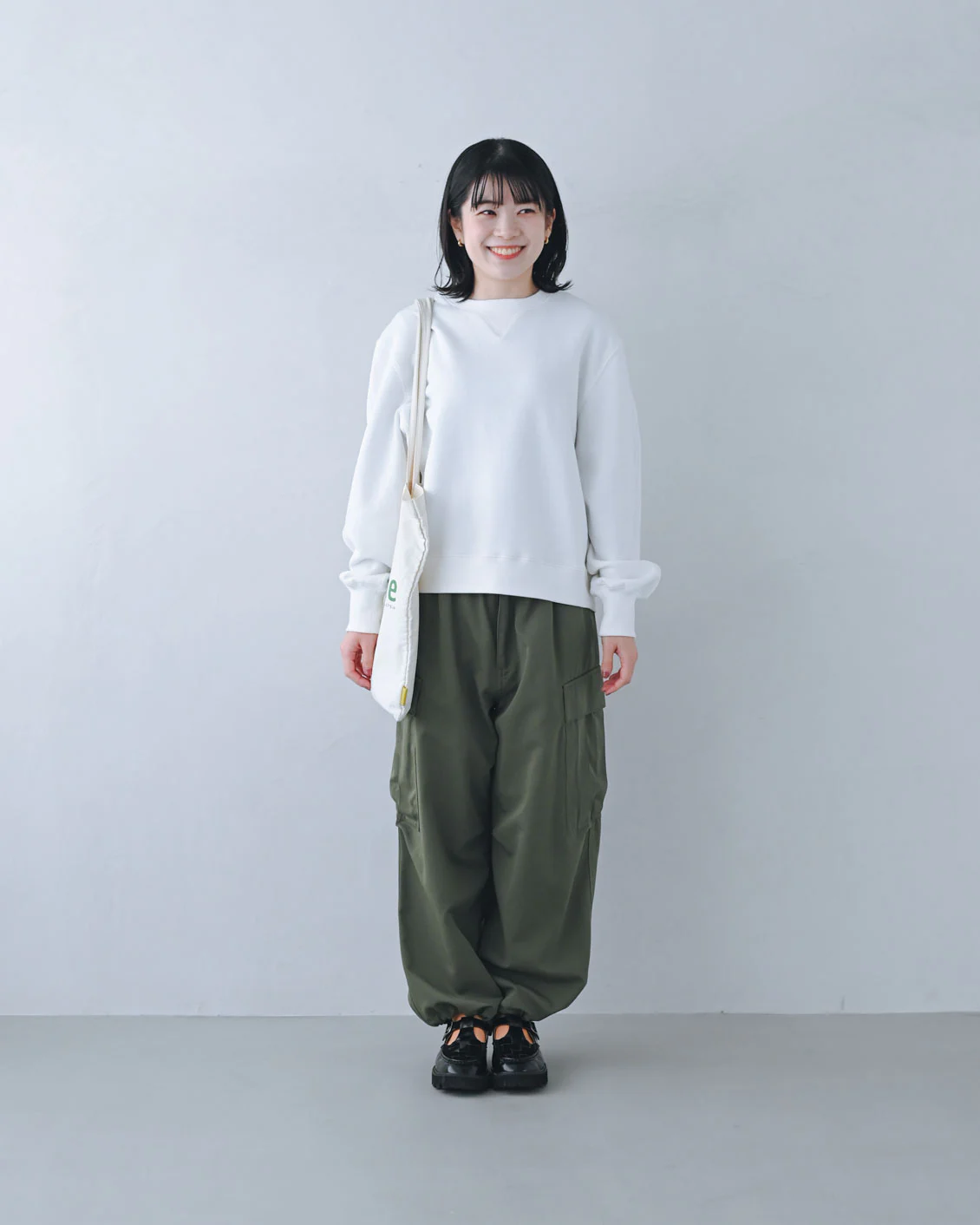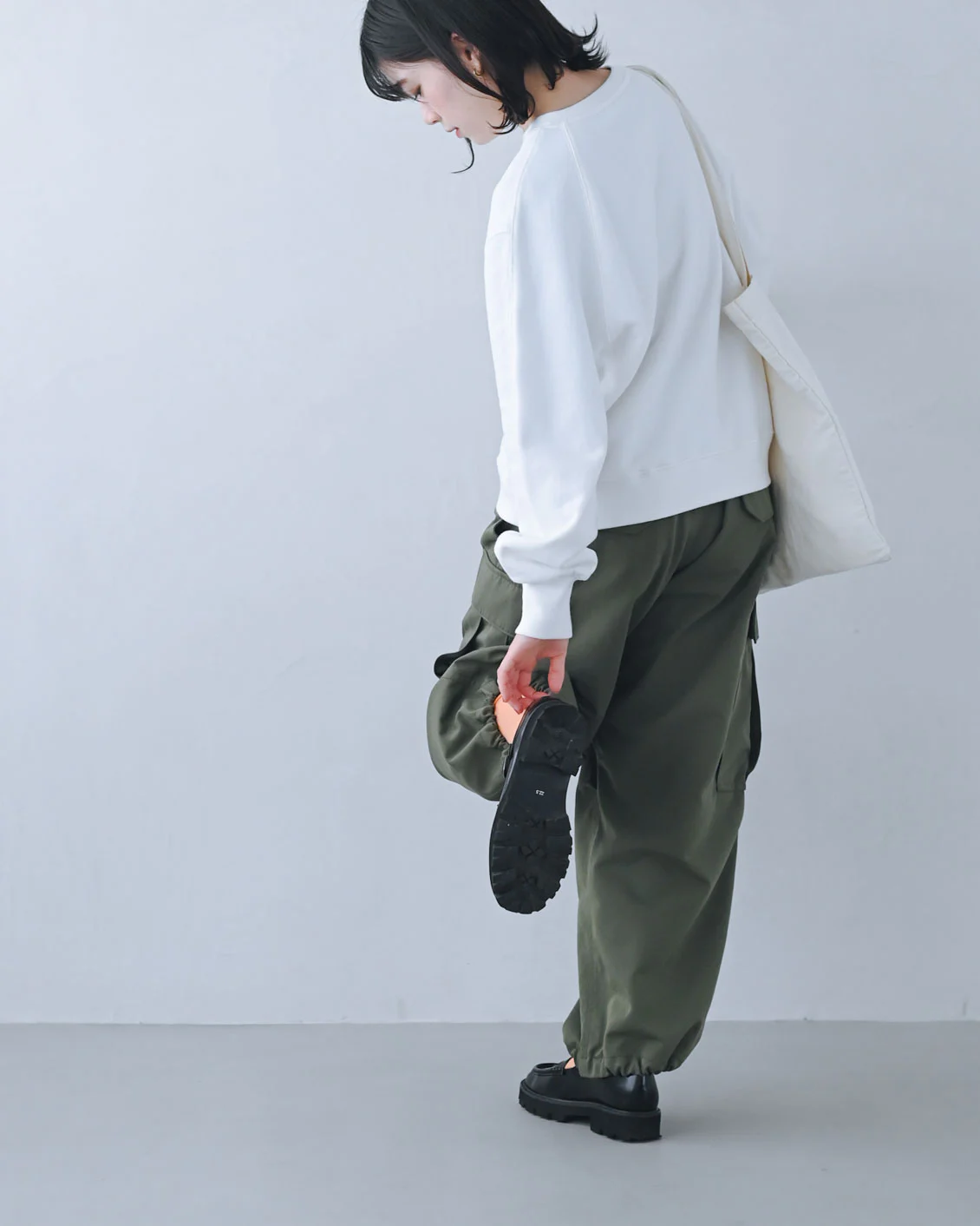 「まずはカジュアルに、真っ白なスウェットとカーキのカーゴパンツ、オレンジ色の靴下に合わせてみました。