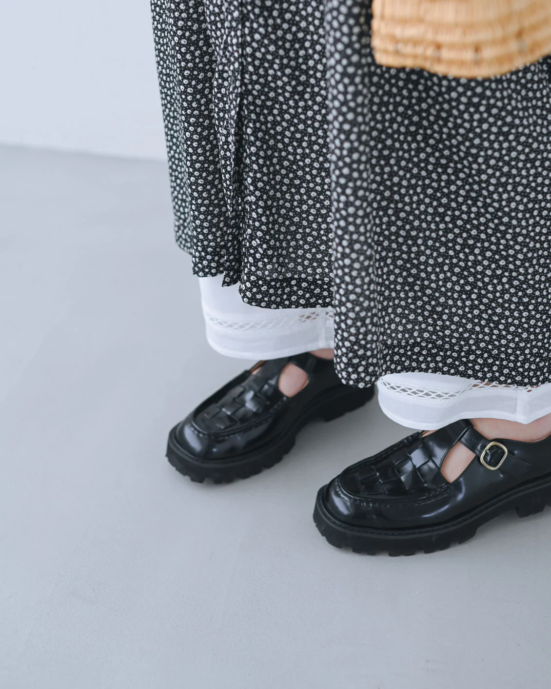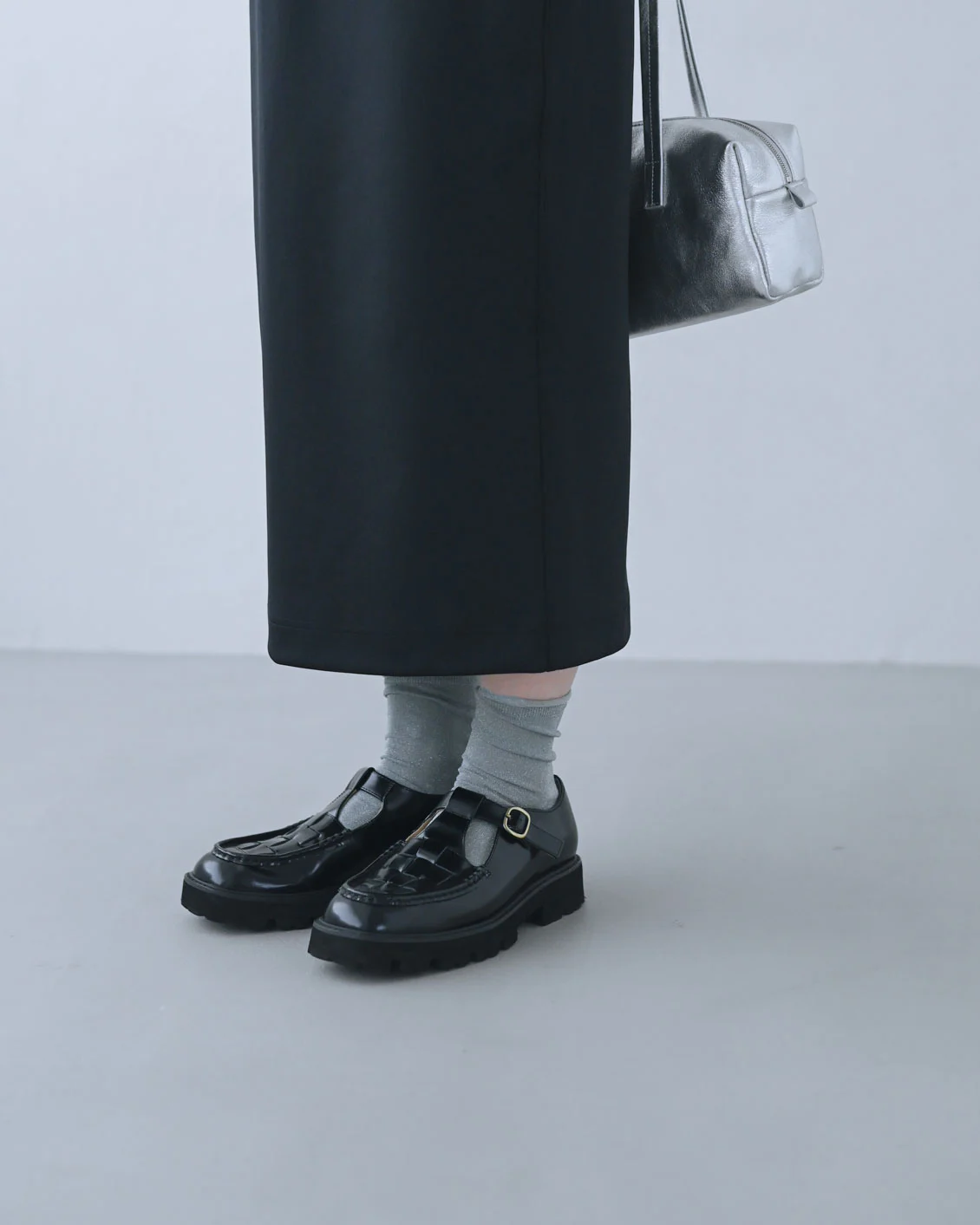 「スカートに合わせると、Tストラップの良さが効いてきますね。ベルトの金具がきらっとしたり、靴下のラメも見えて可愛いです。