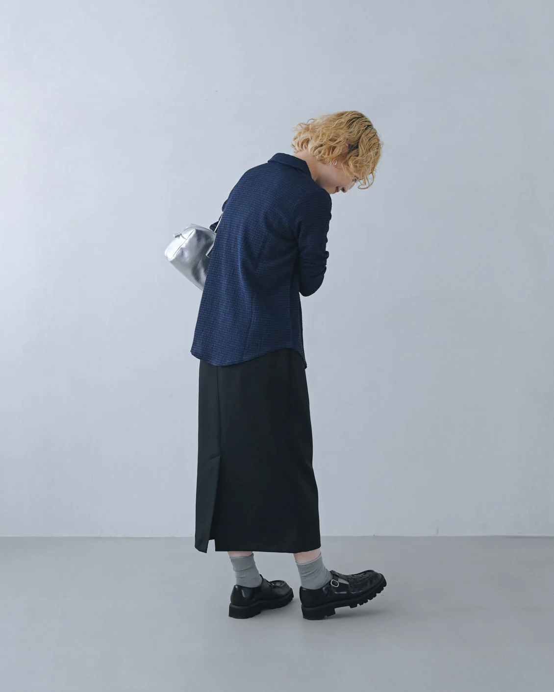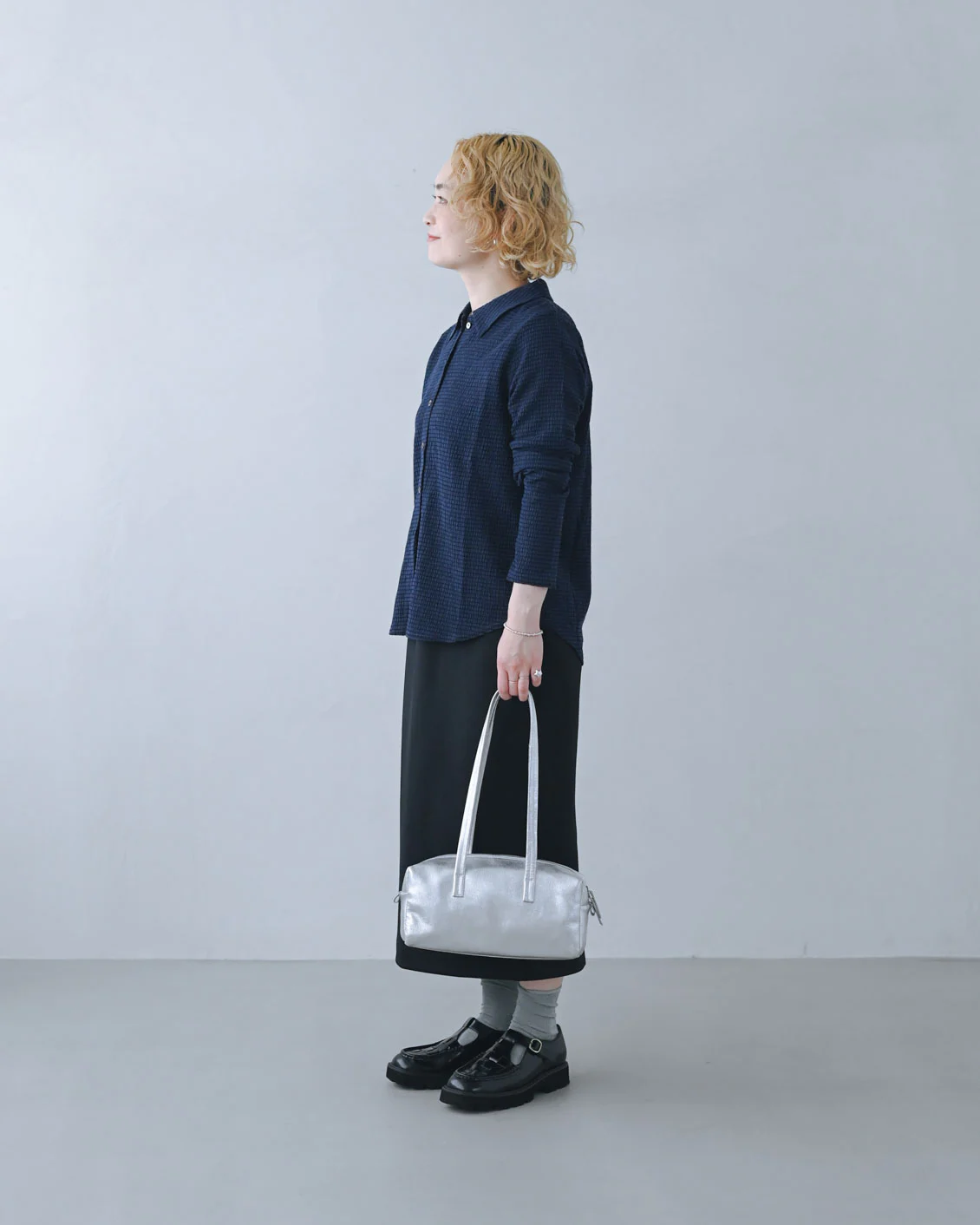 「ブラウスと、ナロースカートにも合わせてみました。暗色コーデを軽やかにしたくて、小物はシルバーを選んでいます。