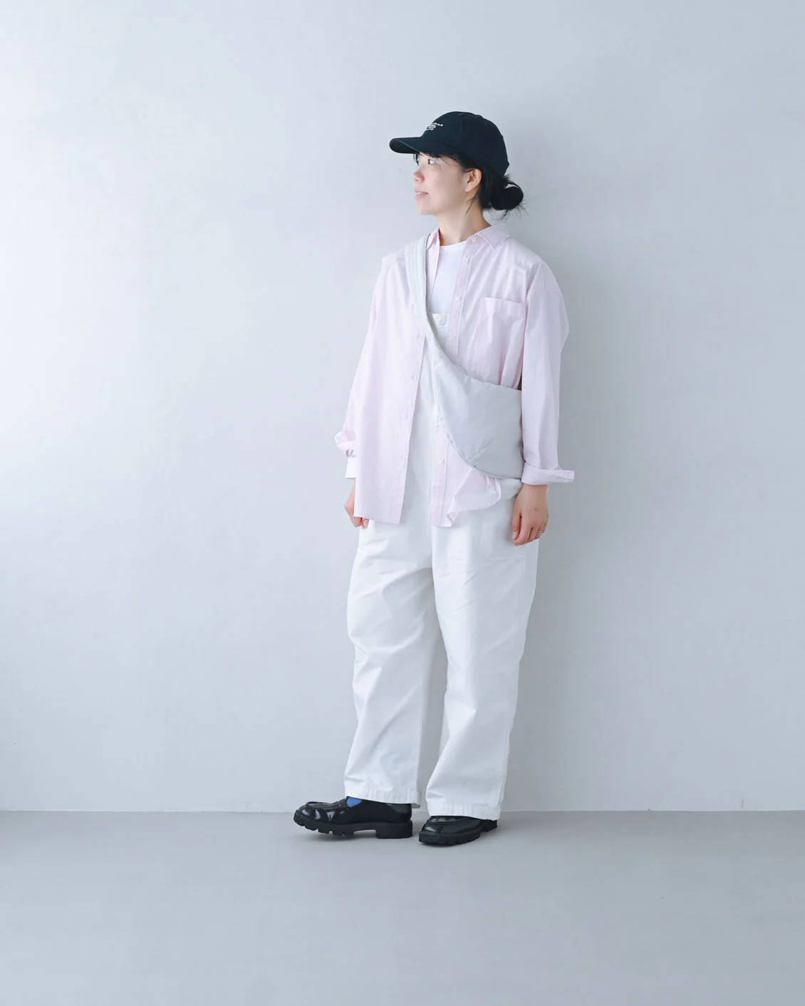 「淡いピンク色のシャツや、白いサロペットに合わせてみました。休日、子どもとの外出でたくさん歩くけれど、少しお出かけモードにしたいというときにはこんなコーデで過ごしたいです。