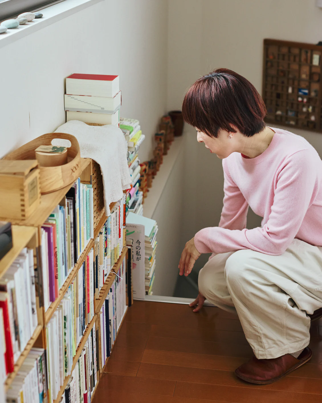 お邪魔すると、廊下の一角にたくさんの本が。積読専用の本棚です。