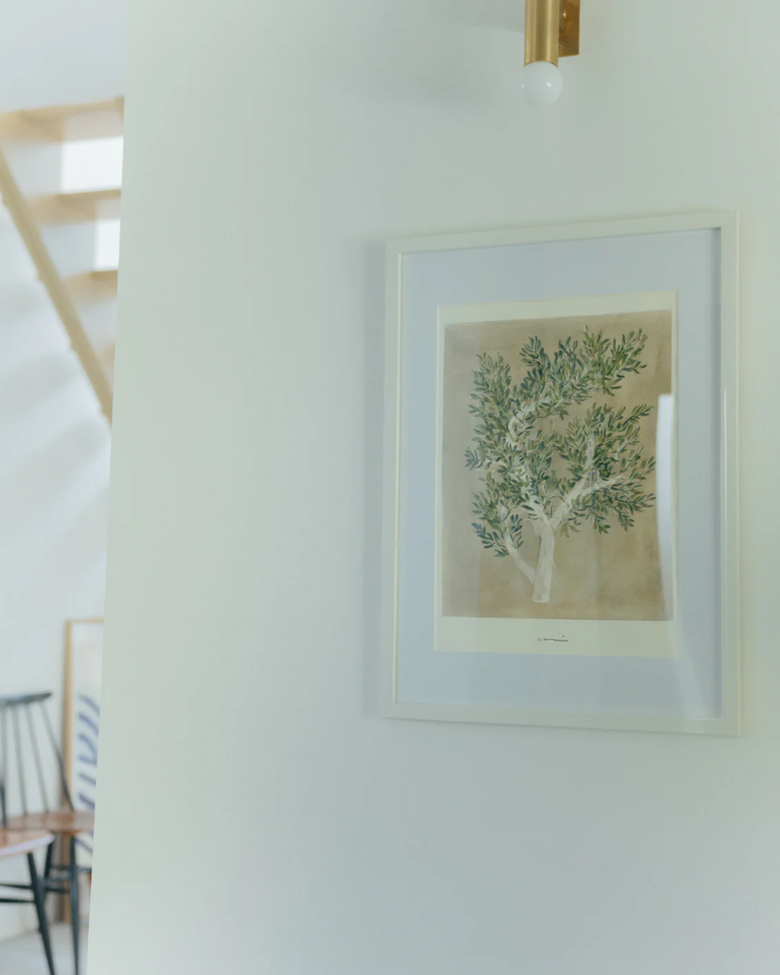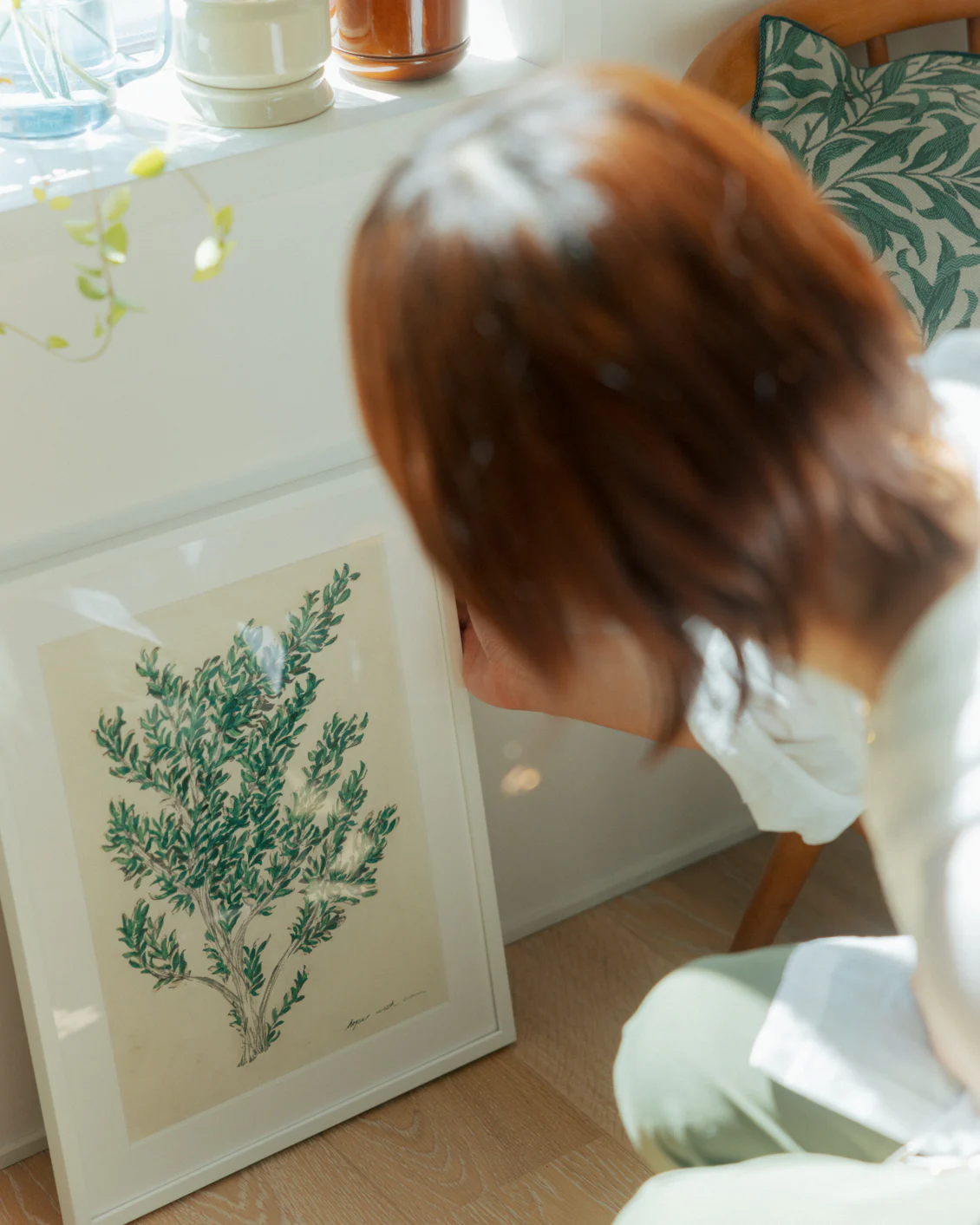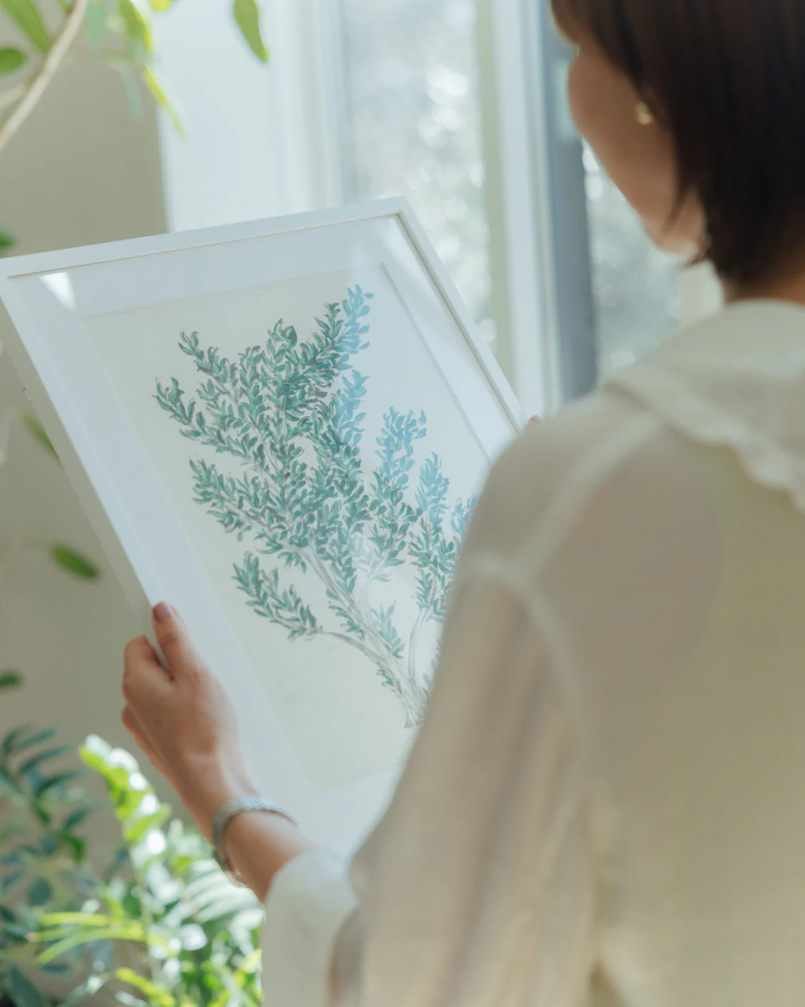額装には、絵の解釈の余地を狭めず、どんなインテリアにも馴染む白を選び、ひとさじの特別感を演出するマットを入れました。