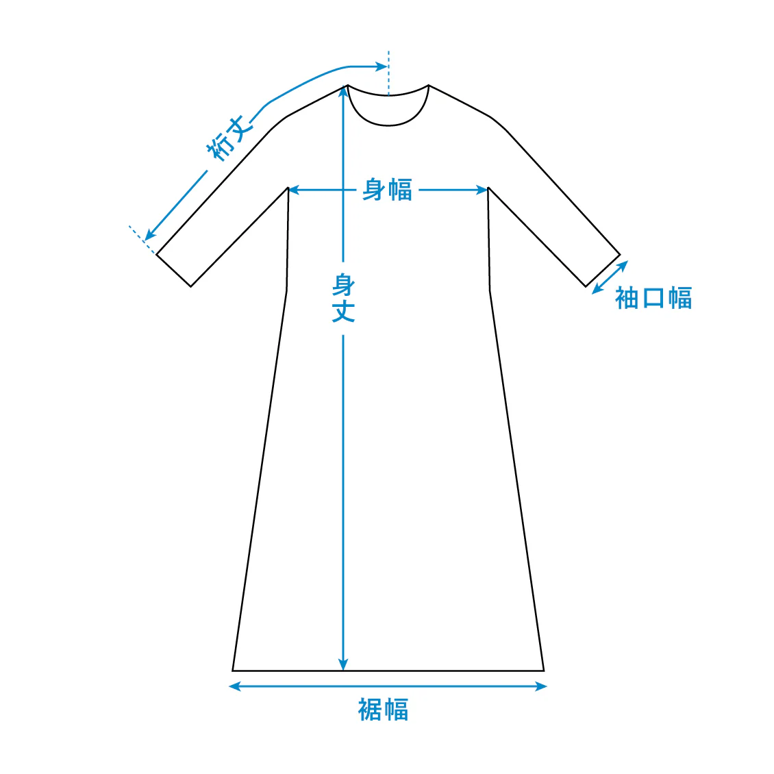 着丈は一番短い部分だとふくらはぎを覆う丈。長い部分で足首にかかる長さです。袖丈は二の腕を覆う長さがありました。