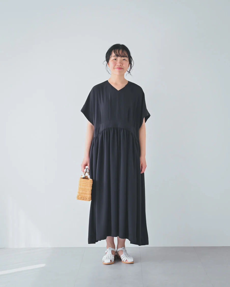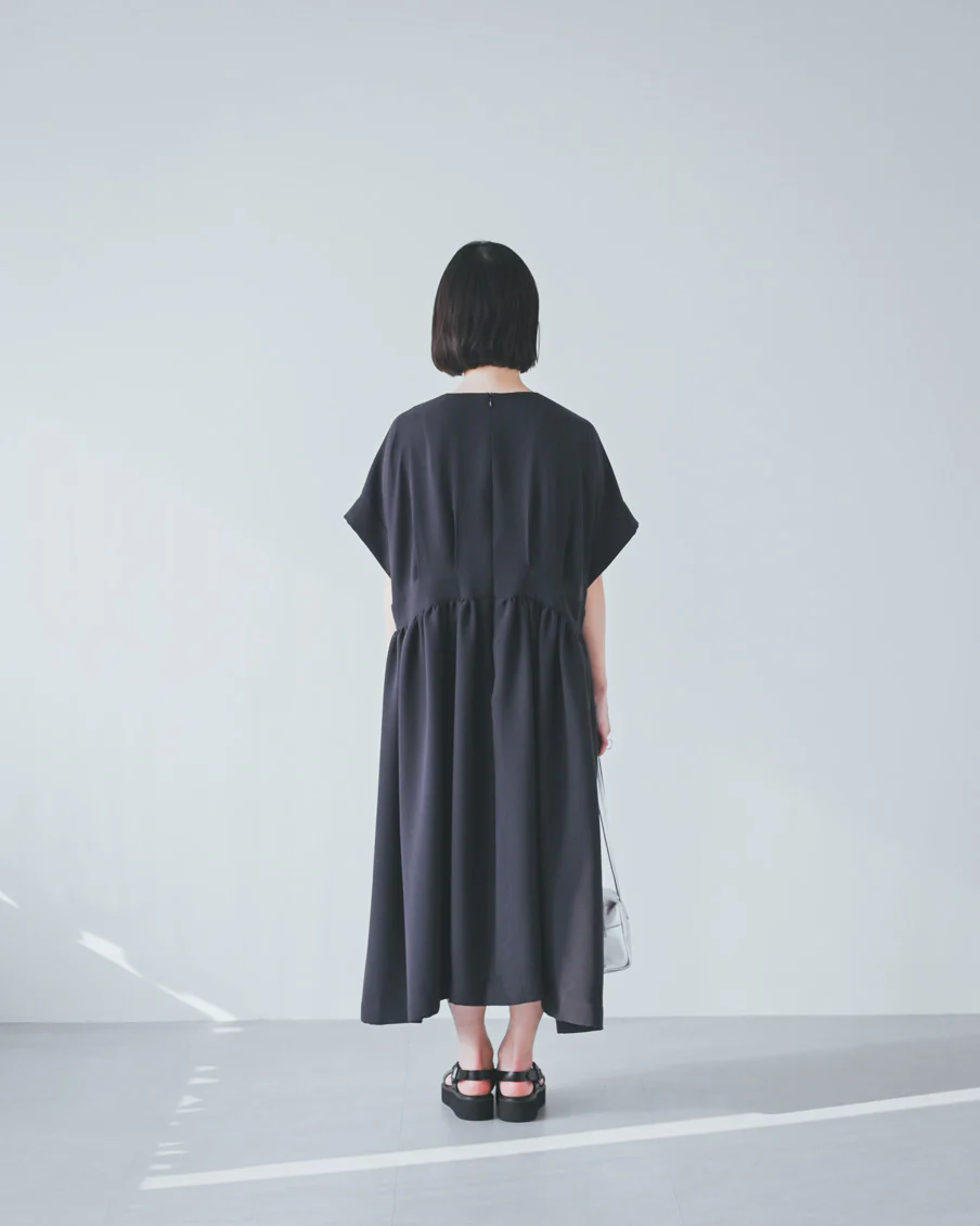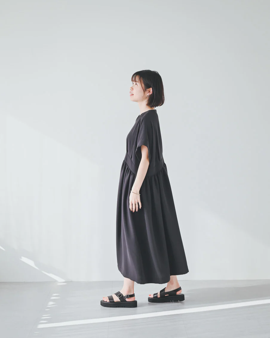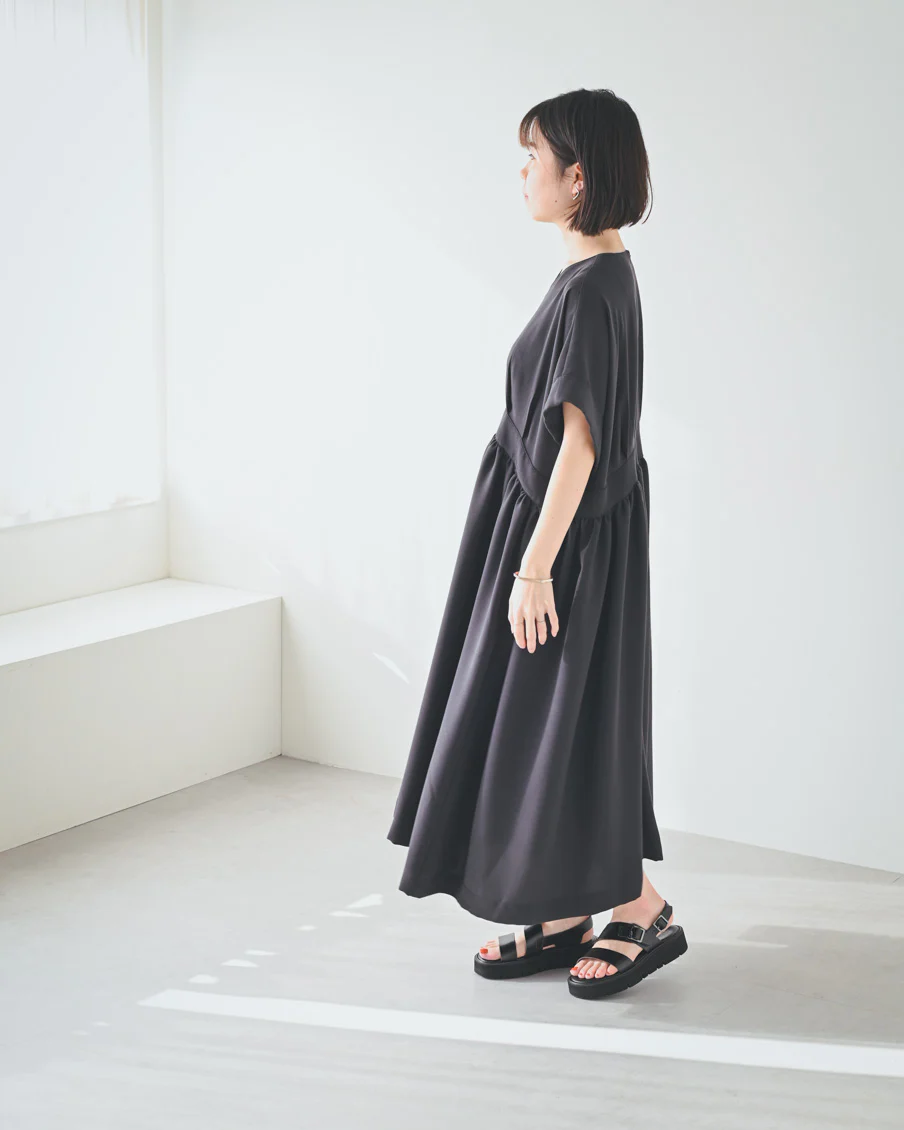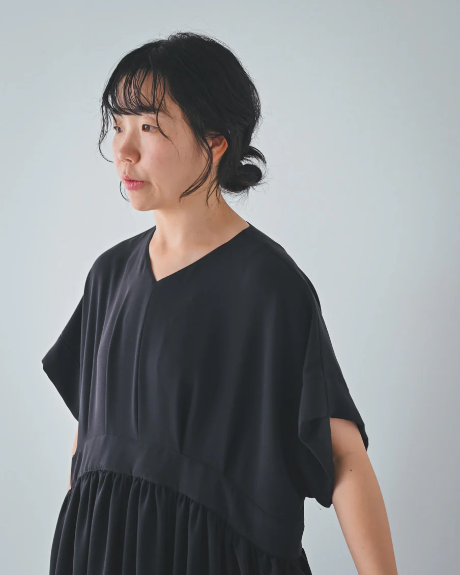 とろみのある素材なので落ち感があり、たっぷりのギャザーでも身体が大きく見えすぎないなと感じました。肌離れもよく、汗をかいても張り付く感じはなさそうです」