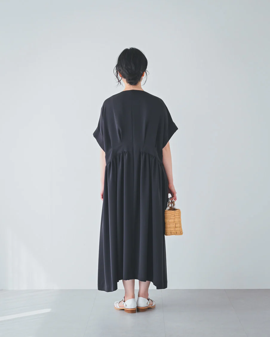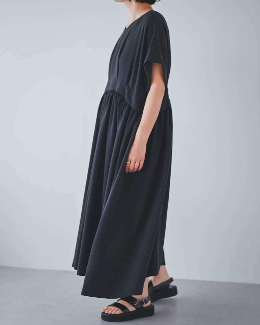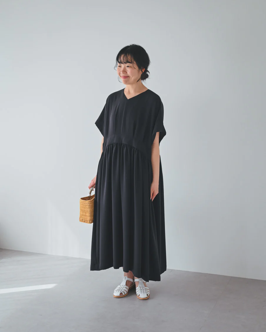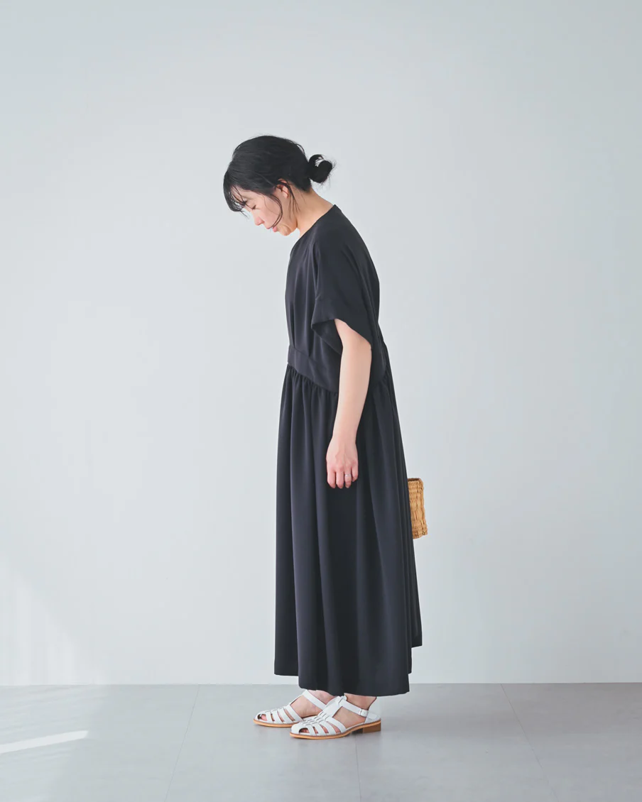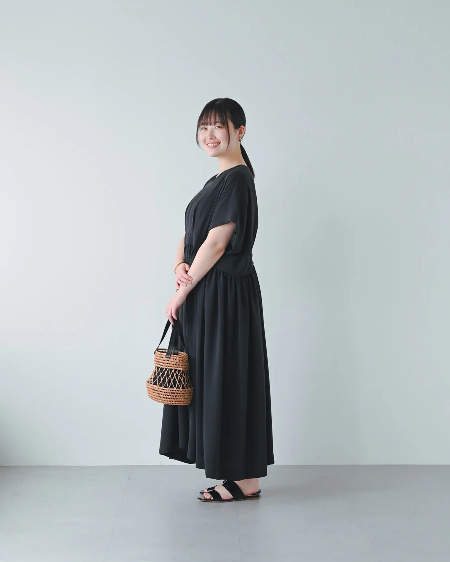 とろみのある素材なので落ち感があり、たっぷりのギャザーでも身体が大きく見えすぎないなと感じました。肌離れもよく、汗をかいても張り付く感じはなさそうです」