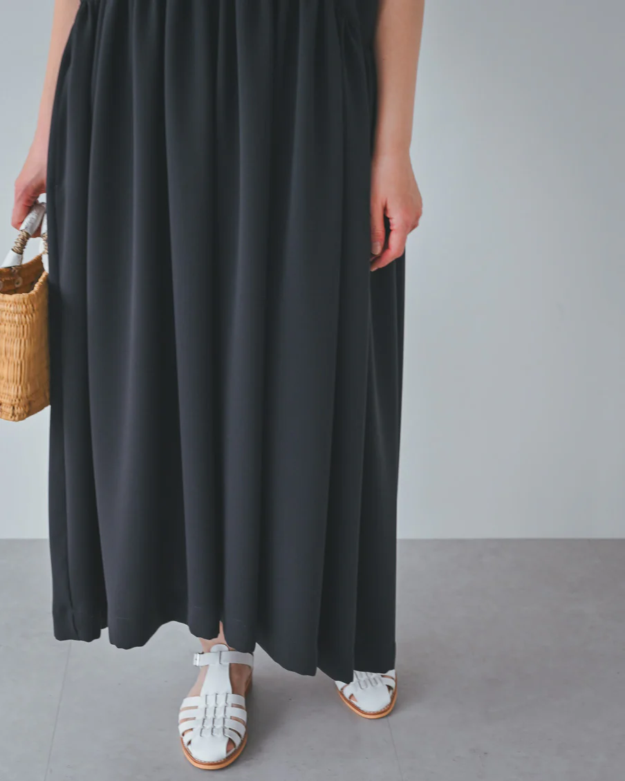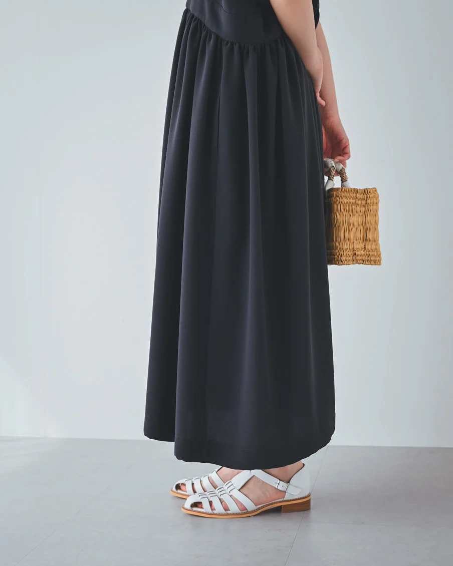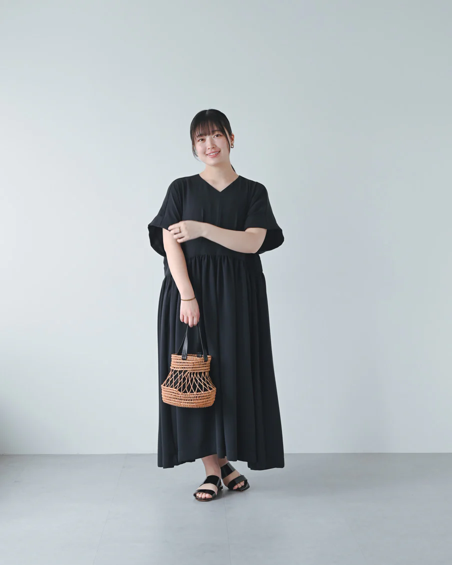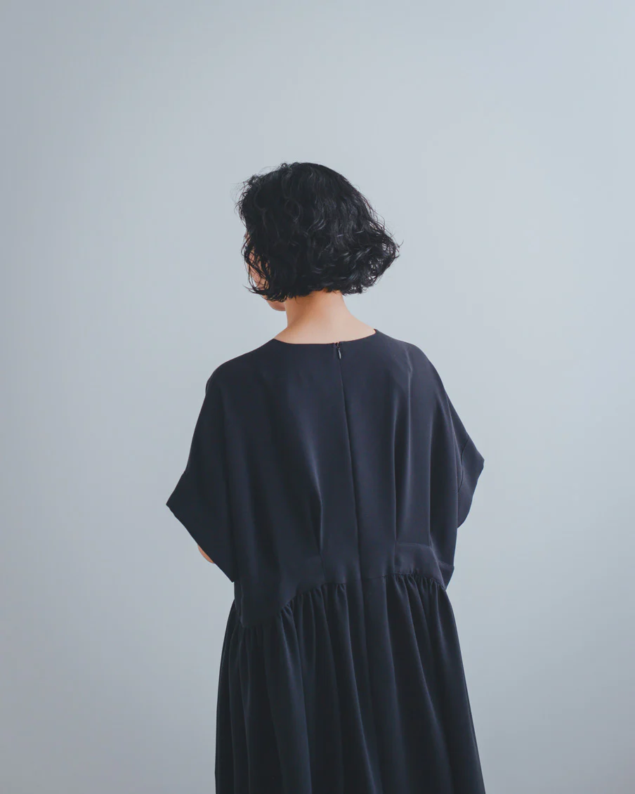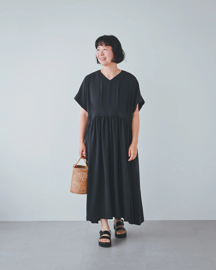 とろみのある素材なので落ち感があり、たっぷりのギャザーでも身体が大きく見えすぎないなと感じました。肌離れもよく、汗をかいても張り付く感じはなさそうです」