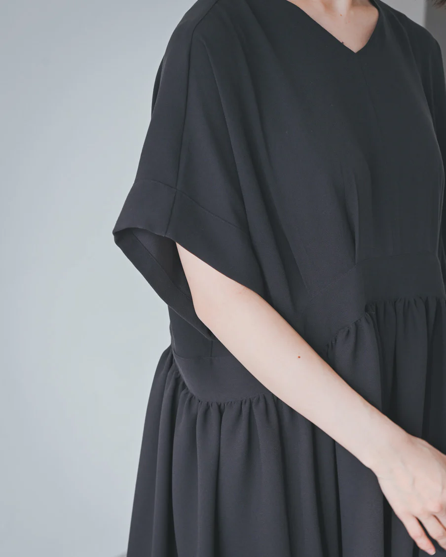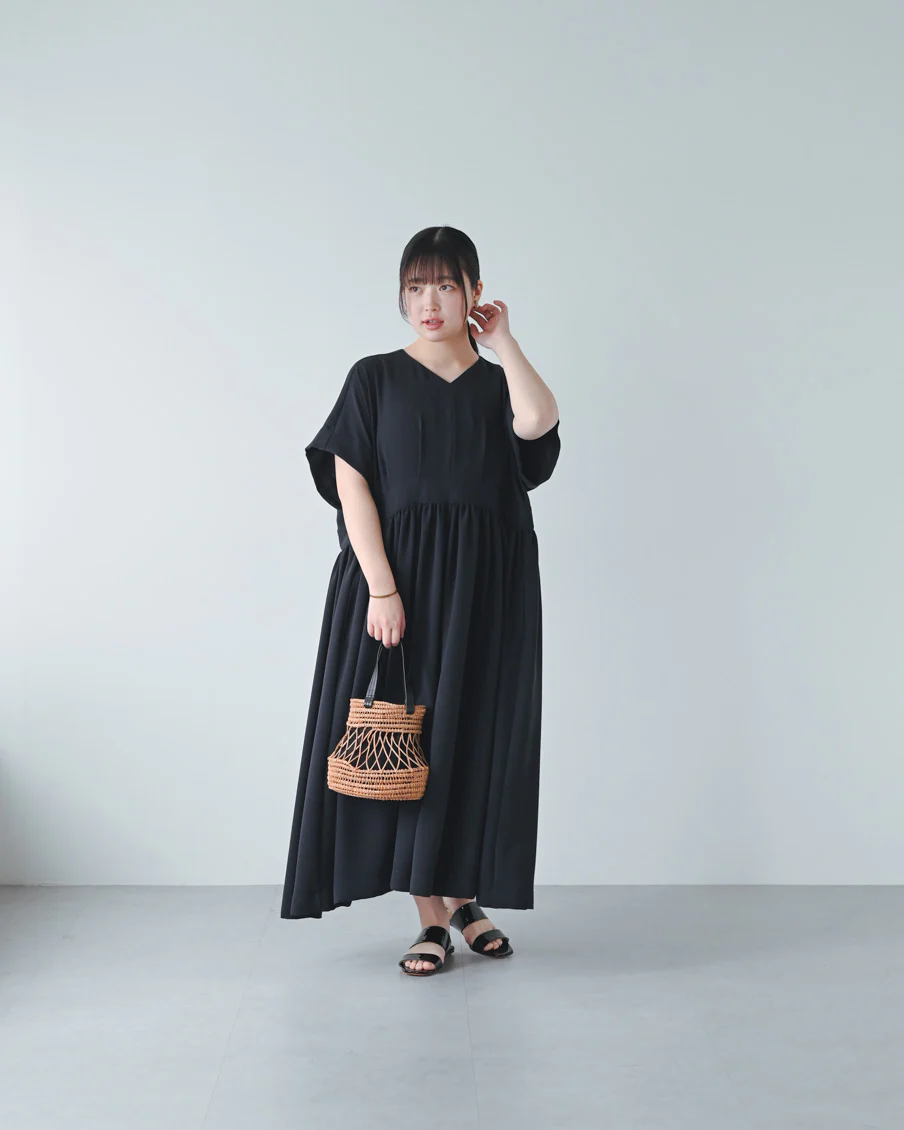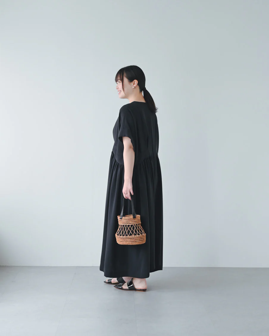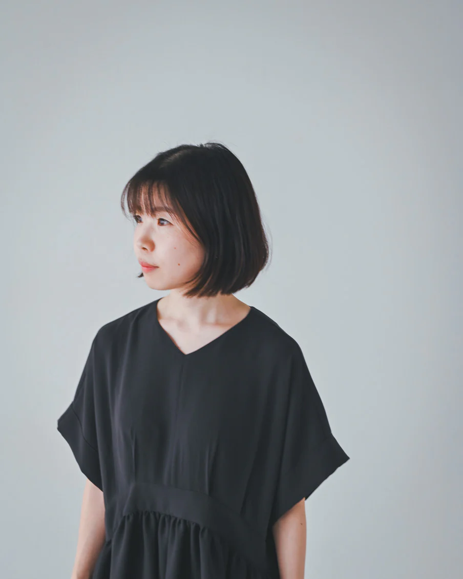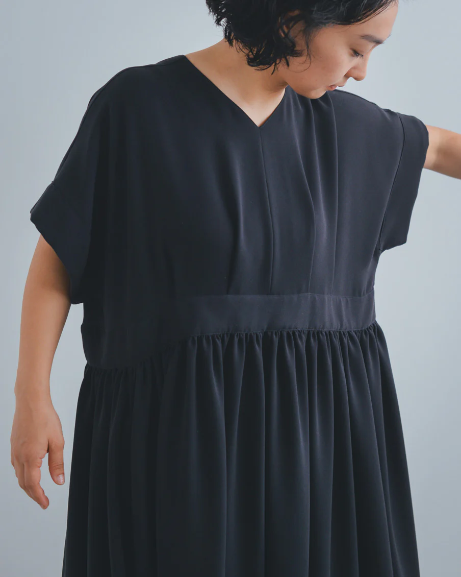 とろみのある素材なので落ち感があり、たっぷりのギャザーでも身体が大きく見えすぎないなと感じました。肌離れもよく、汗をかいても張り付く感じはなさそうです」