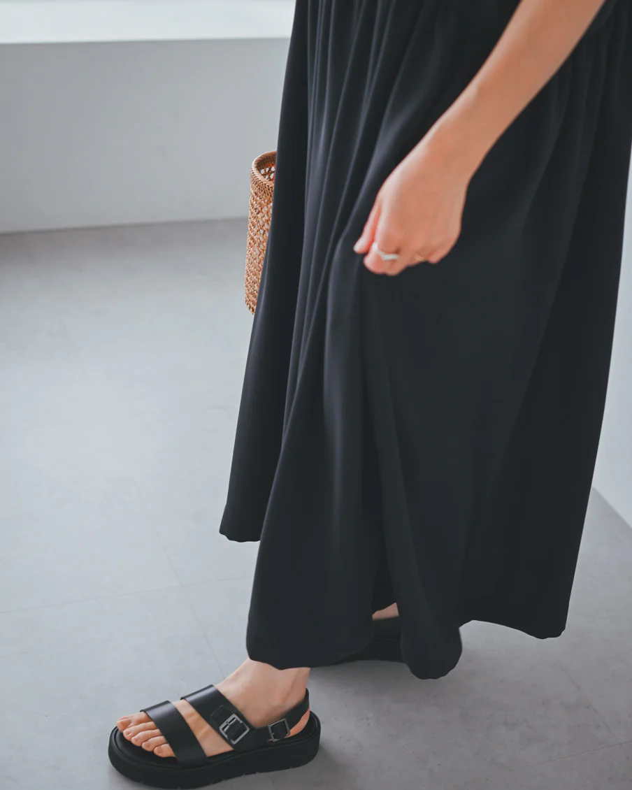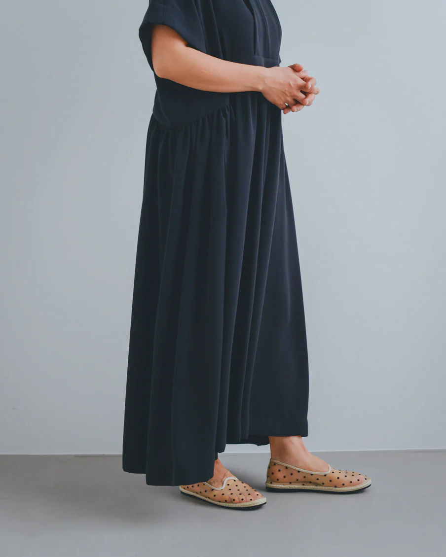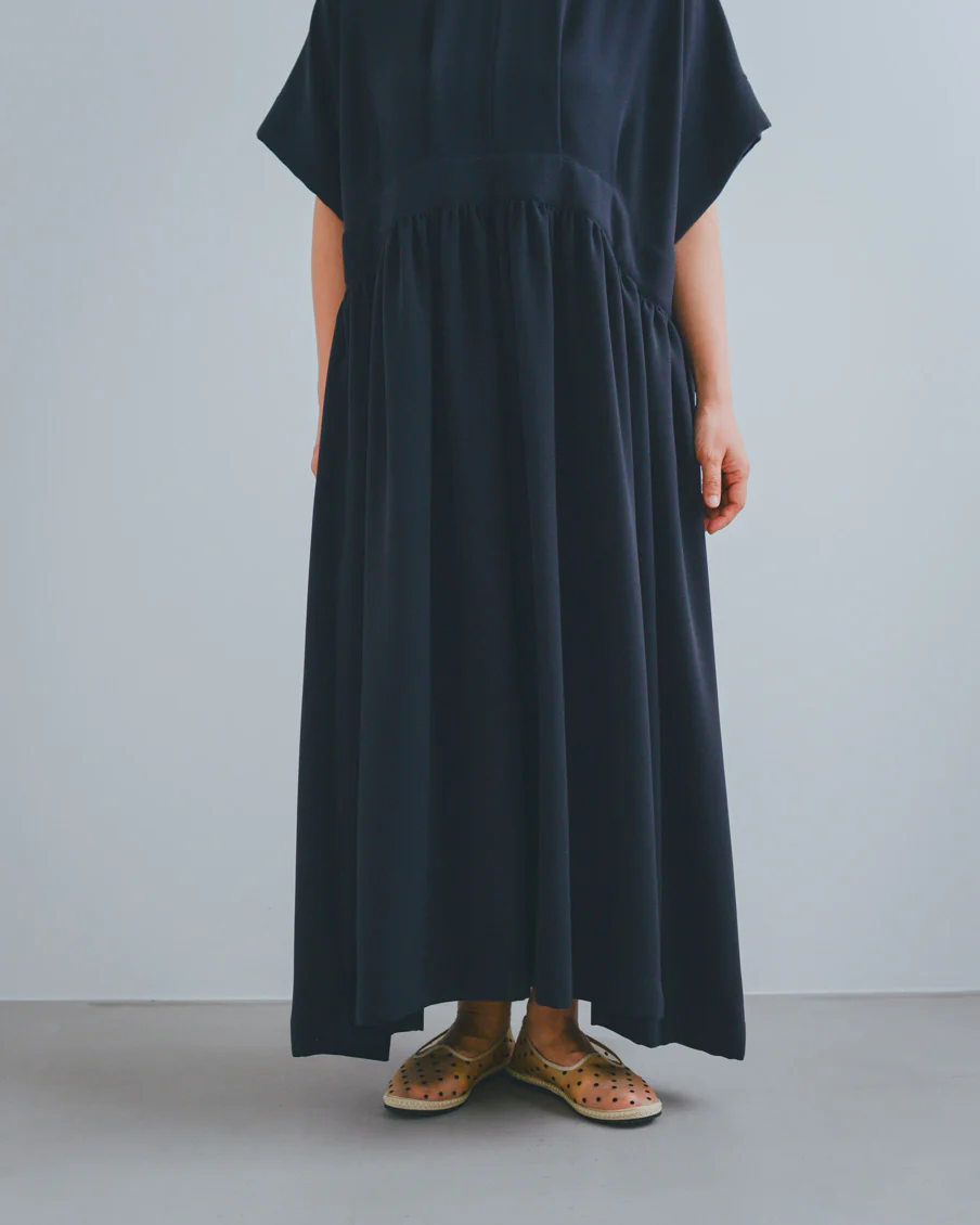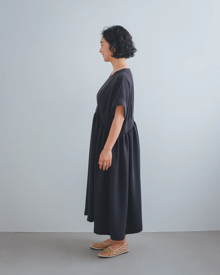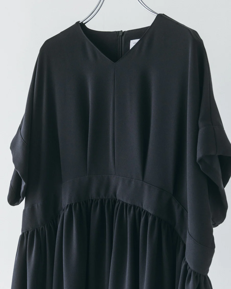 とろみのある素材なので落ち感があり、たっぷりのギャザーでも身体が大きく見えすぎないなと感じました。肌離れもよく、汗をかいても張り付く感じはなさそうです」