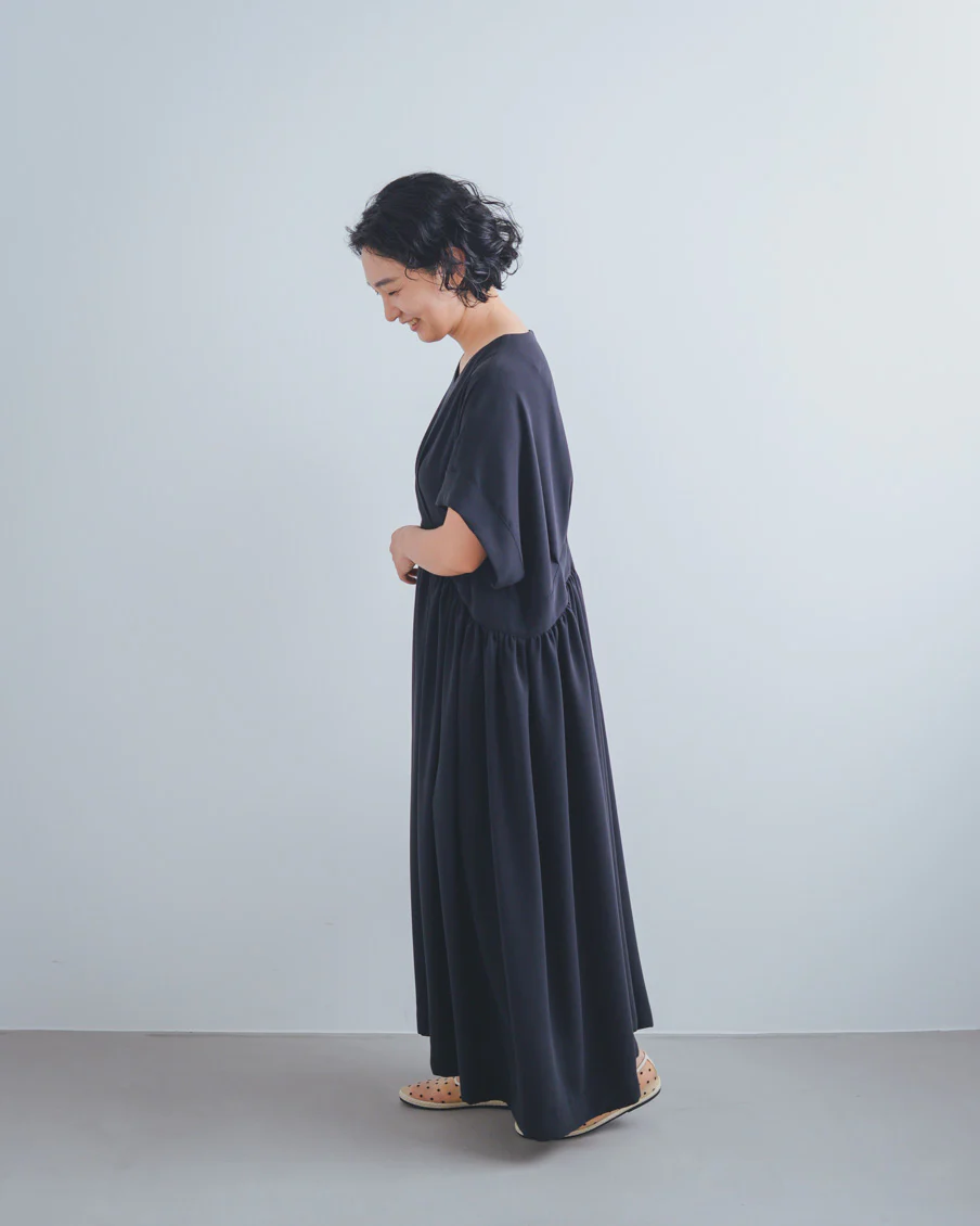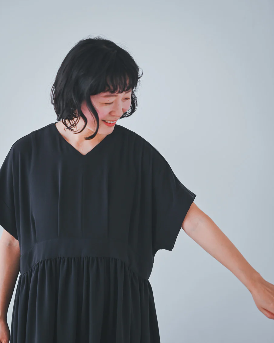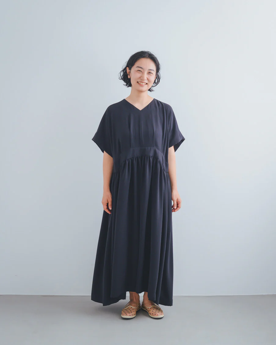 ギャザーがたっぷりあるので太って見えないかなと心配だったのですが、生地がとろんとしていて、縦に落ち感があり、すっきり見えるのも嬉しいなと思いました」