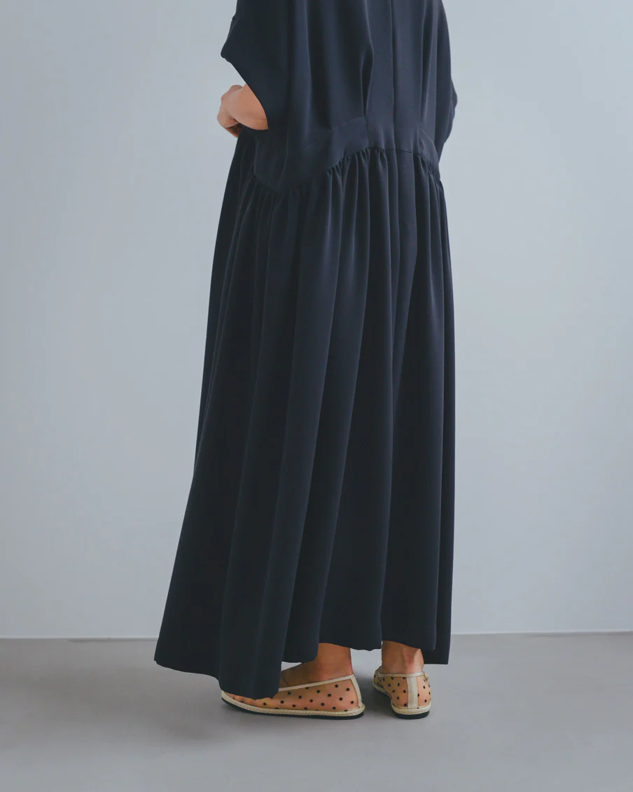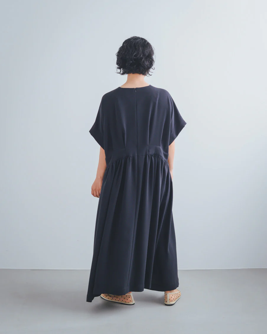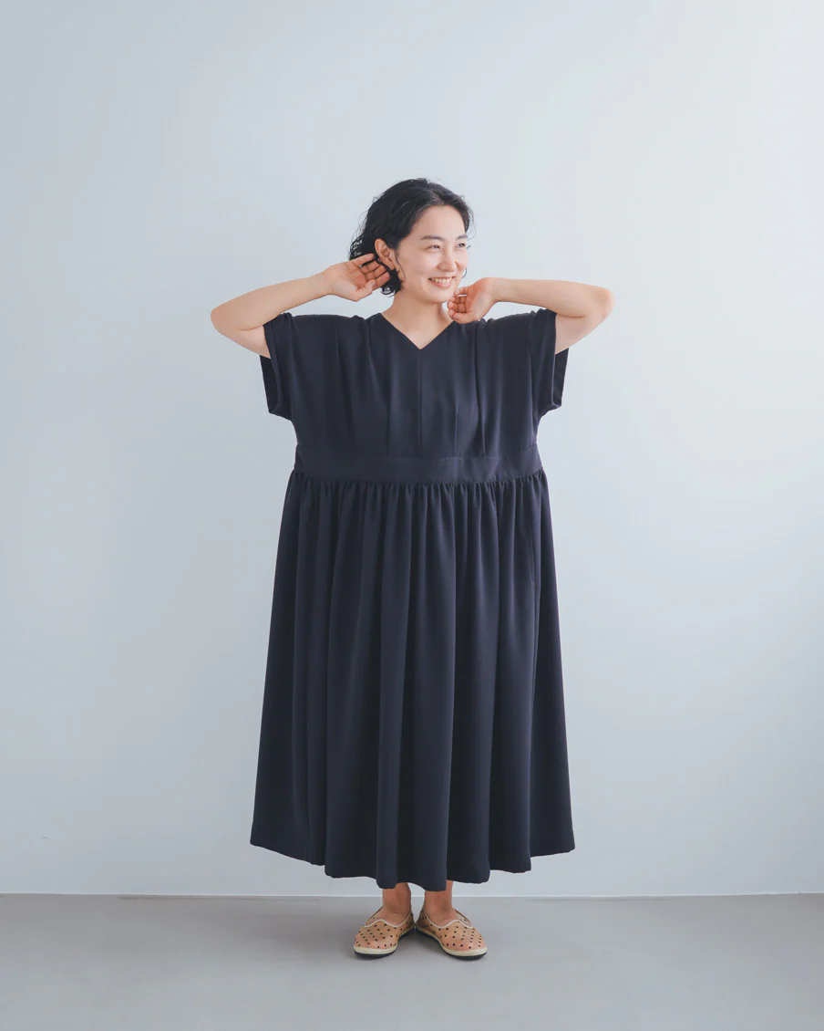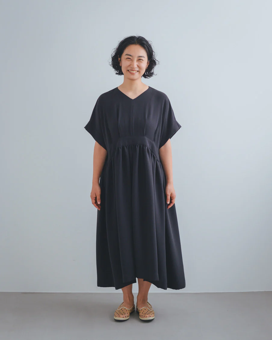ギャザーがたっぷりあるので太って見えないかなと心配だったのですが、生地がとろんとしていて、縦に落ち感があり、すっきり見えるのも嬉しいなと思いました」