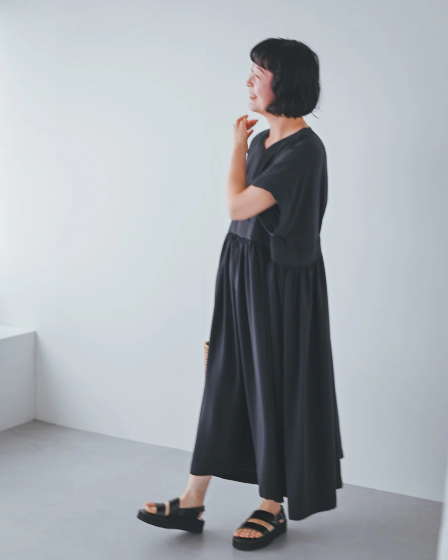 海辺や公園など外で過ごす日にも、風をはらんで気持ちよく着られる一枚。体型は上手に隠しつつ、表情は軽やかに、そんな欲張りをかなえてくれるワンピースです」