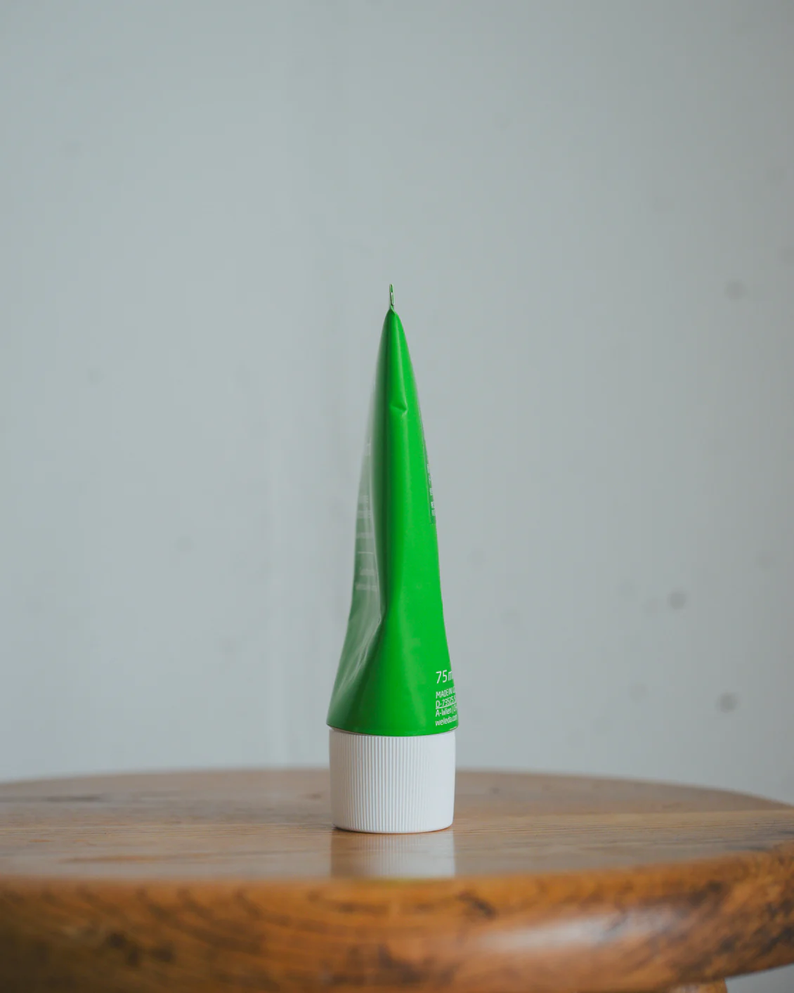 スパチュラを使う手間なしで、清潔に最後まで使いきれる。自立するデザインなので、収納スペースも幅を取らずに収まります。