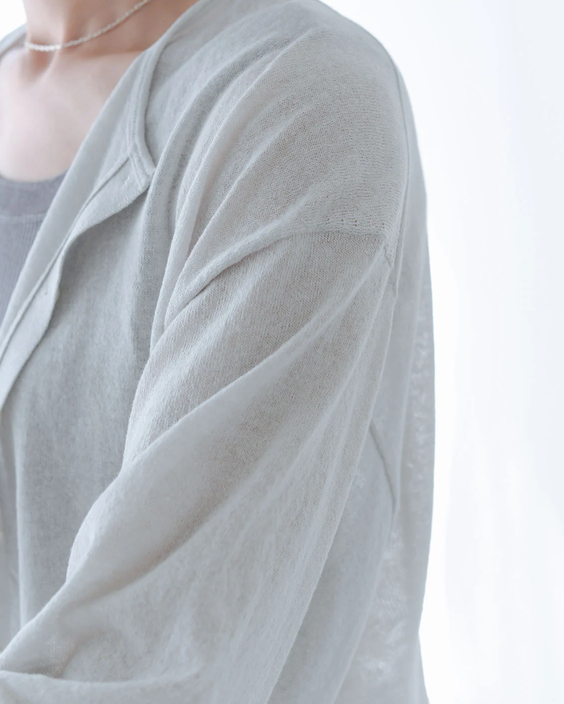 ほんのり透け感がありますが、ソワソワするようなシアー感ではありません。真夏はタンクトップの上からそのまま羽織って重宝しそうです。