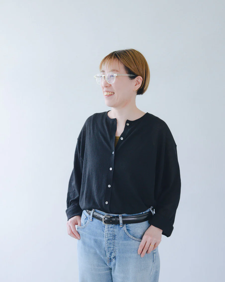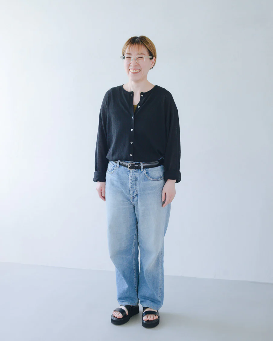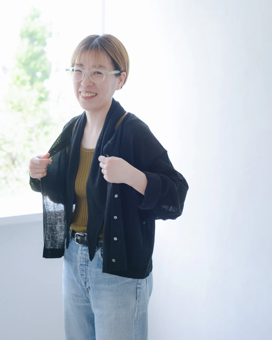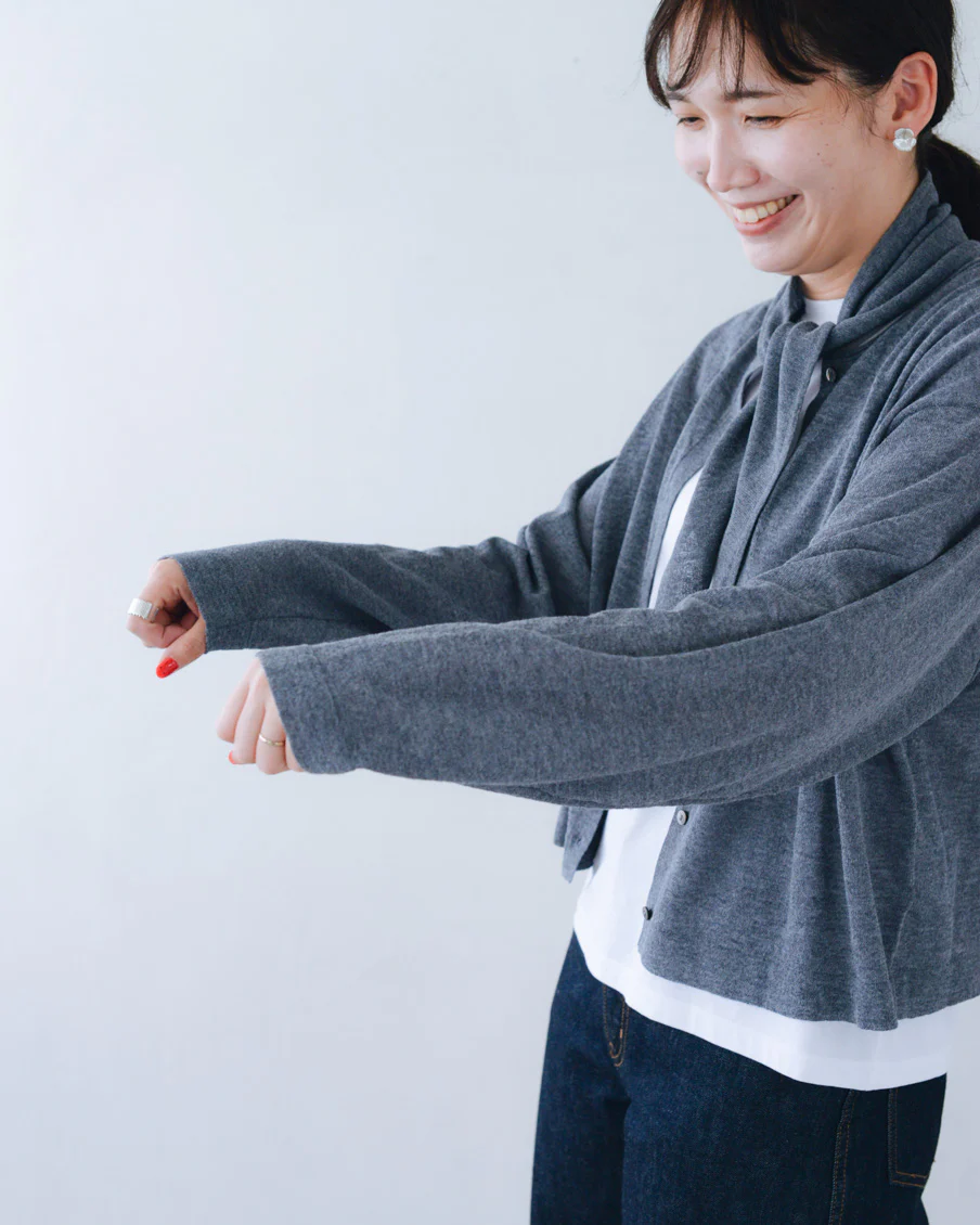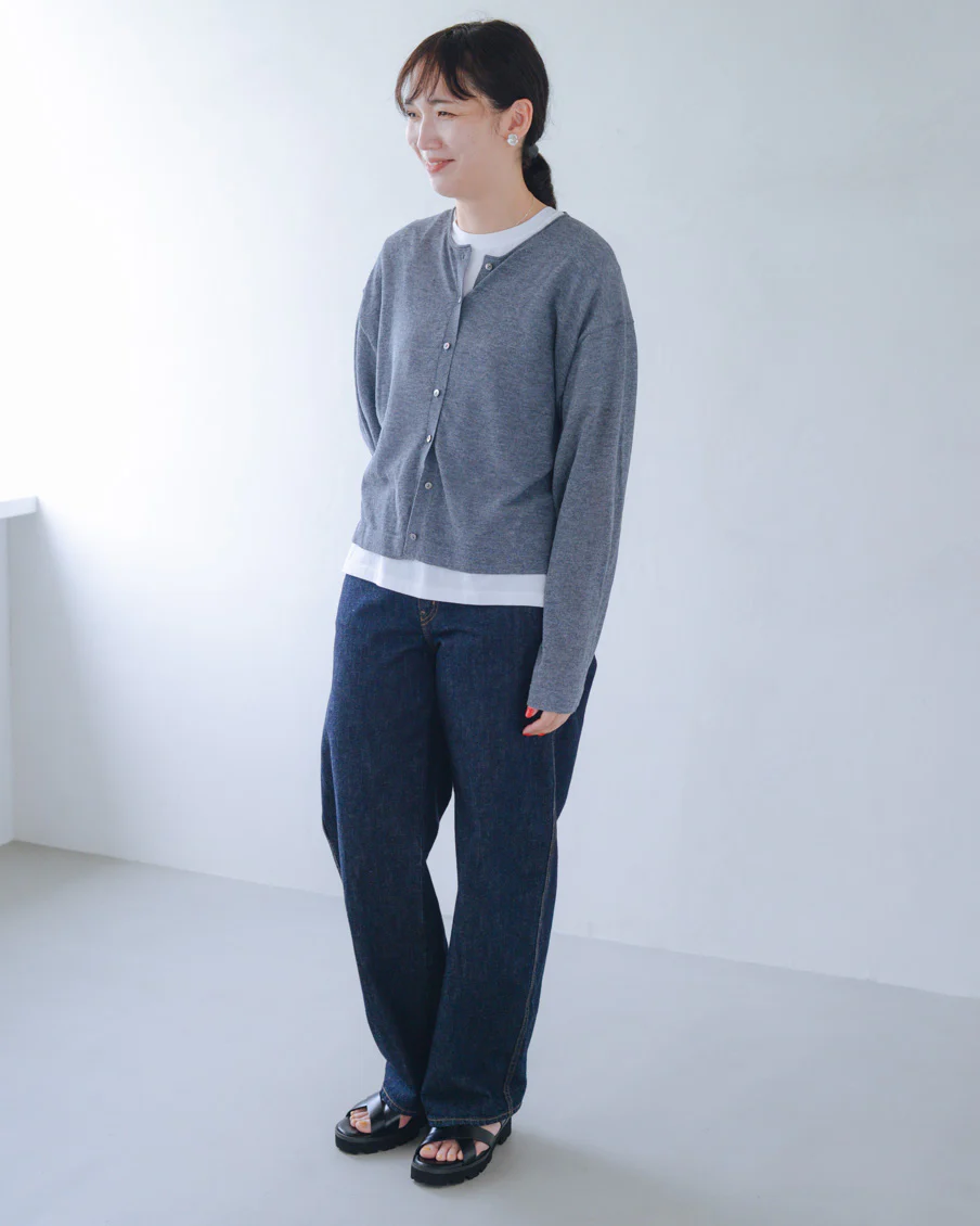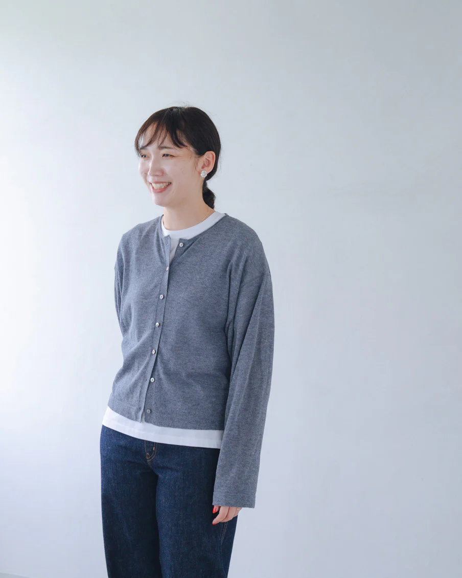 「ボリュームのあるパンツや、ワンピースの上に重ねても、全体のバランスが取りやすく、着られている感じがないのがいいですね。小柄でもすっきり着られるカーディガンだと思います。