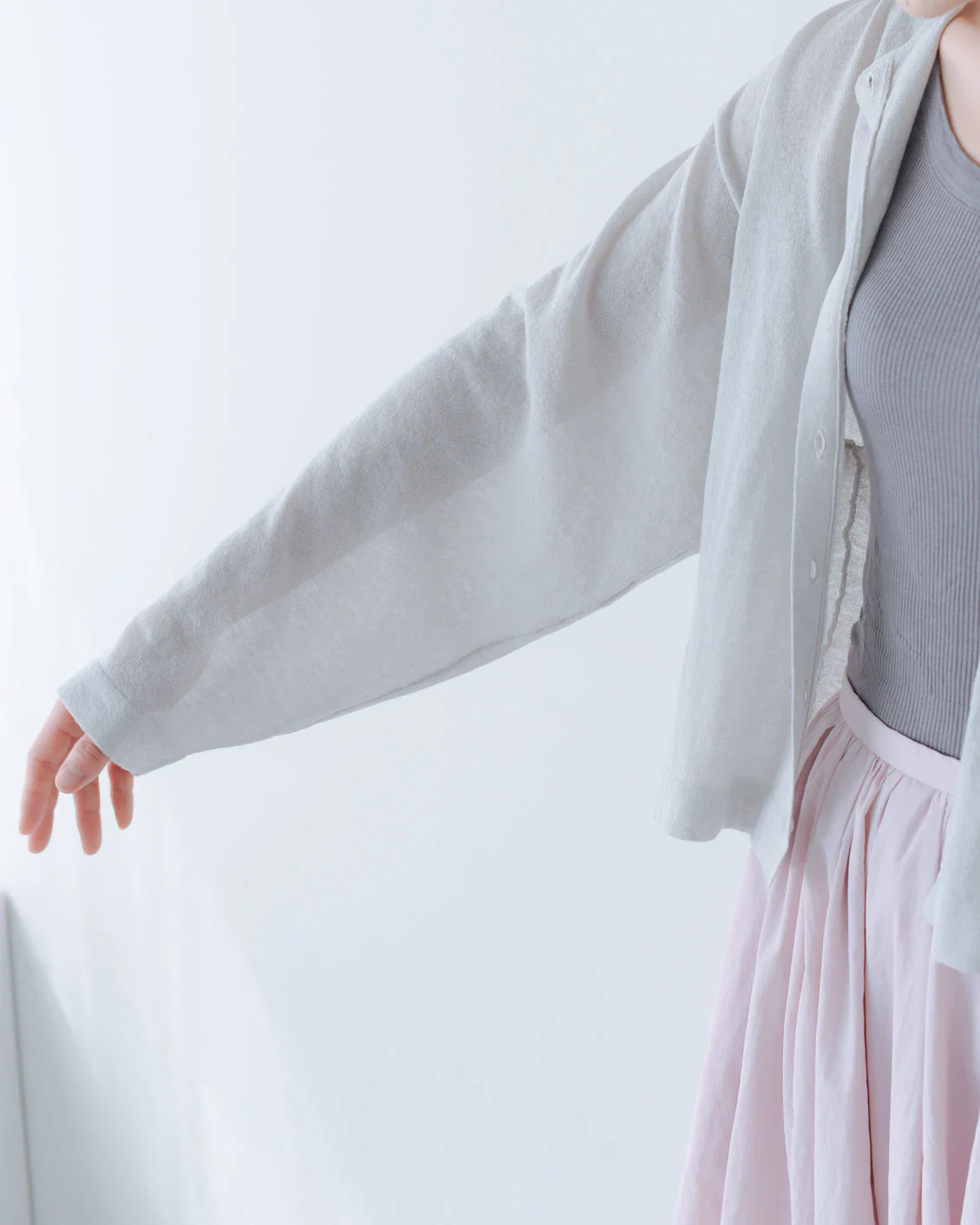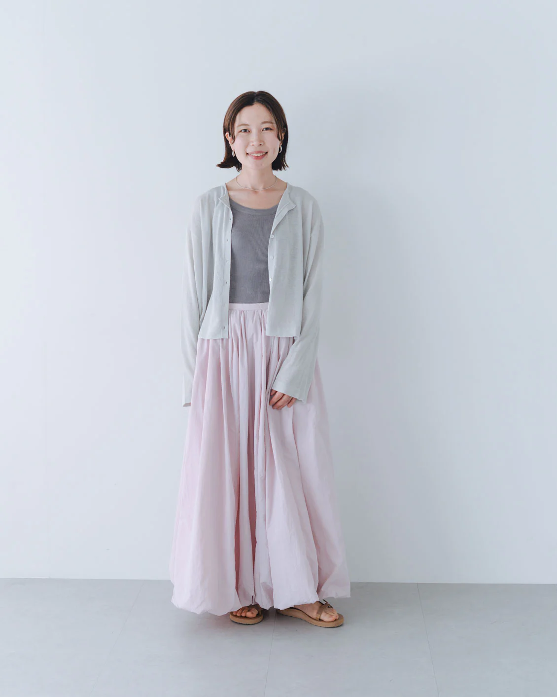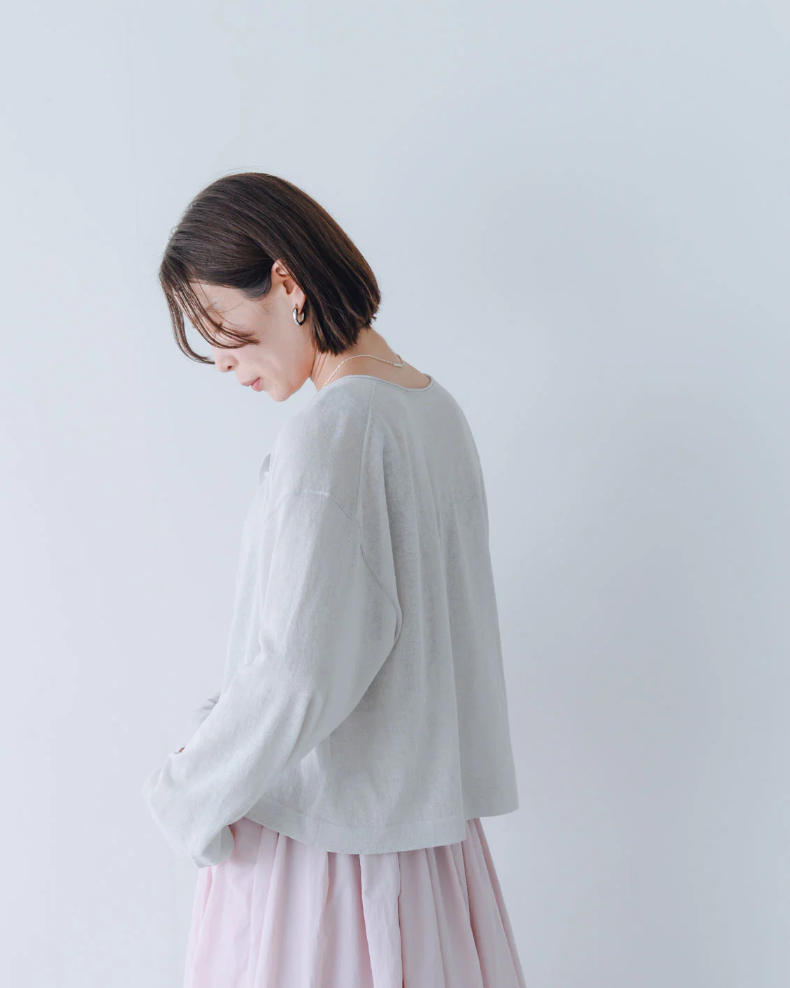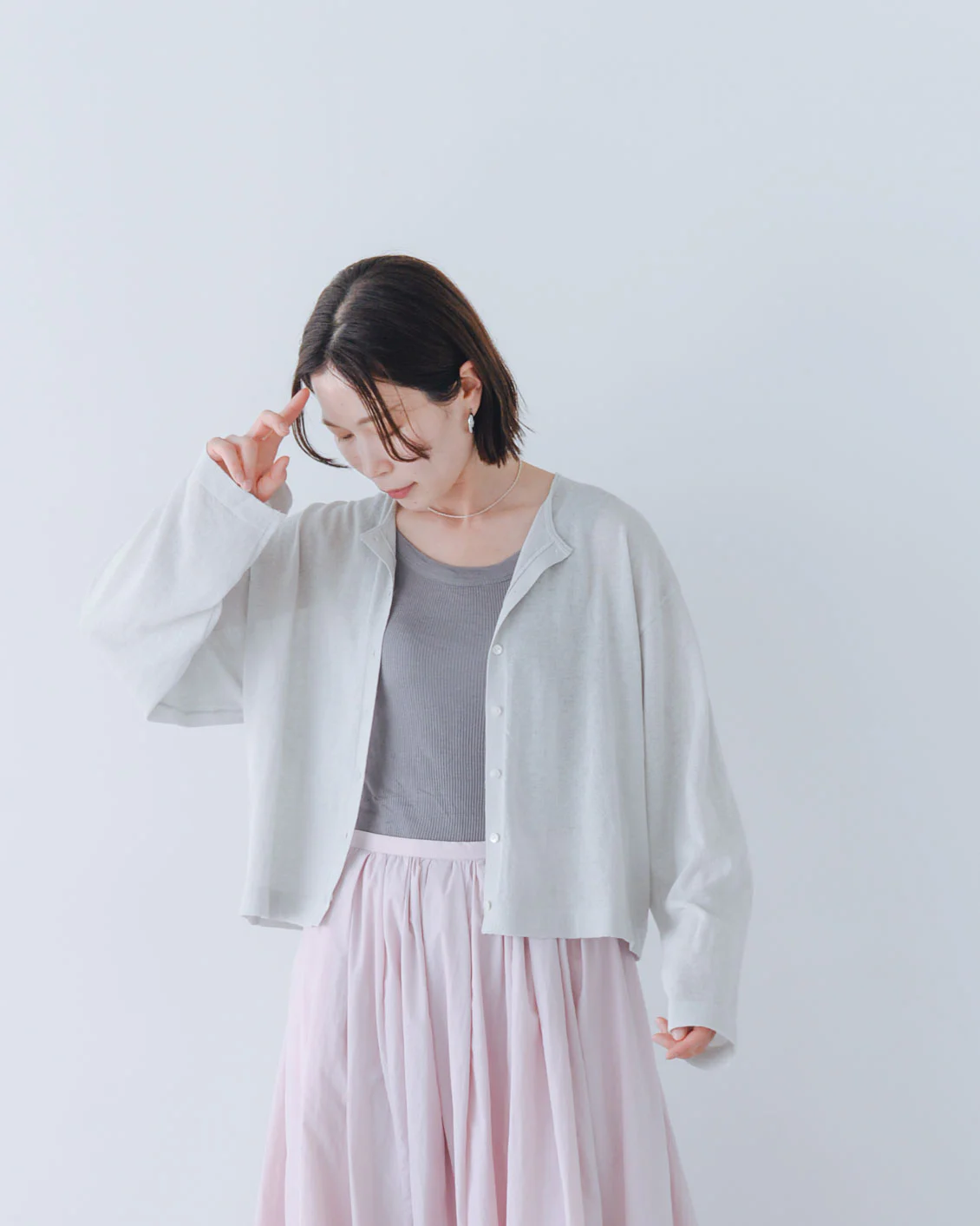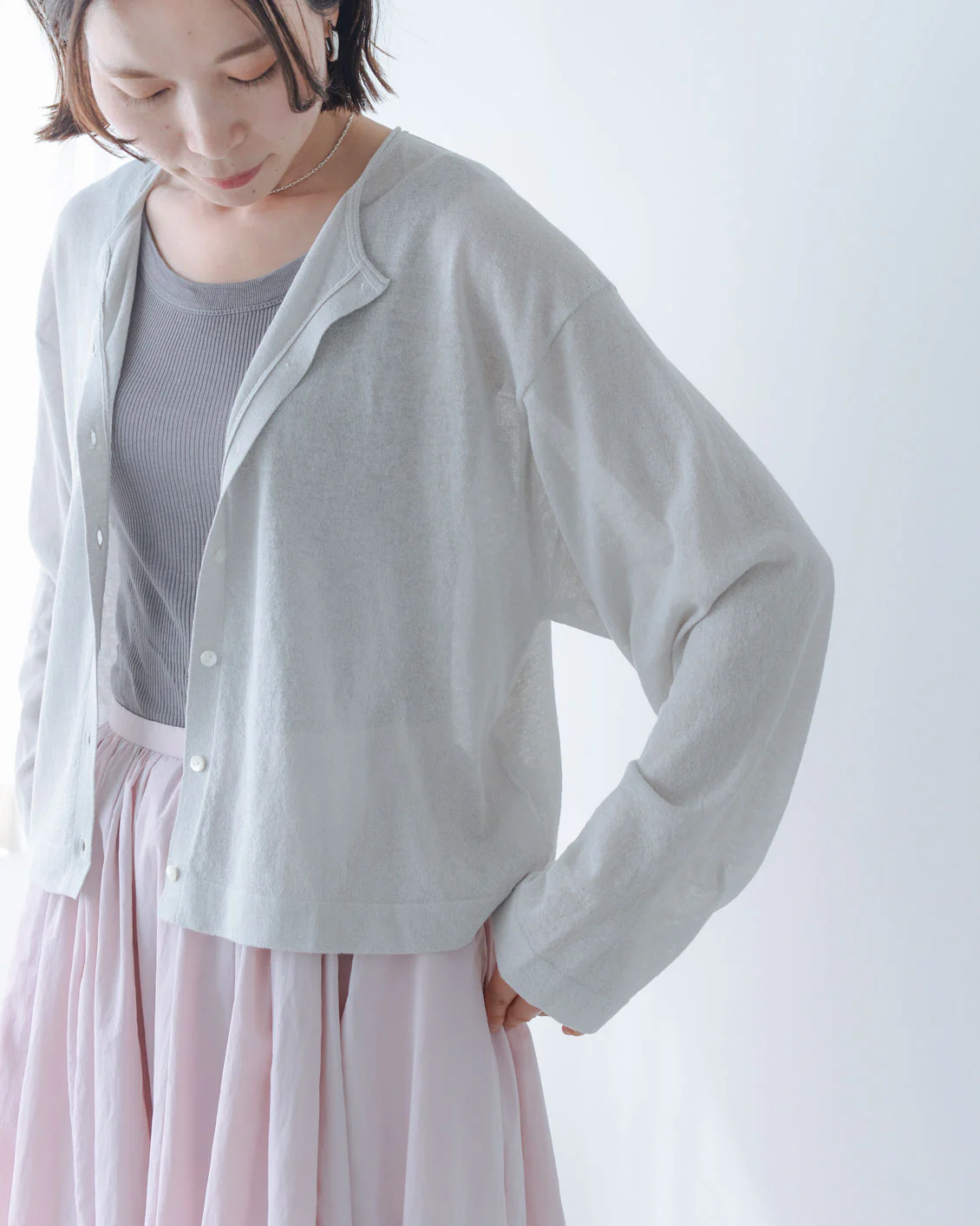 「ボリュームのあるパンツや、ワンピースの上に重ねても、全体のバランスが取りやすく、着られている感じがないのがいいですね。小柄でもすっきり着られるカーディガンだと思います。