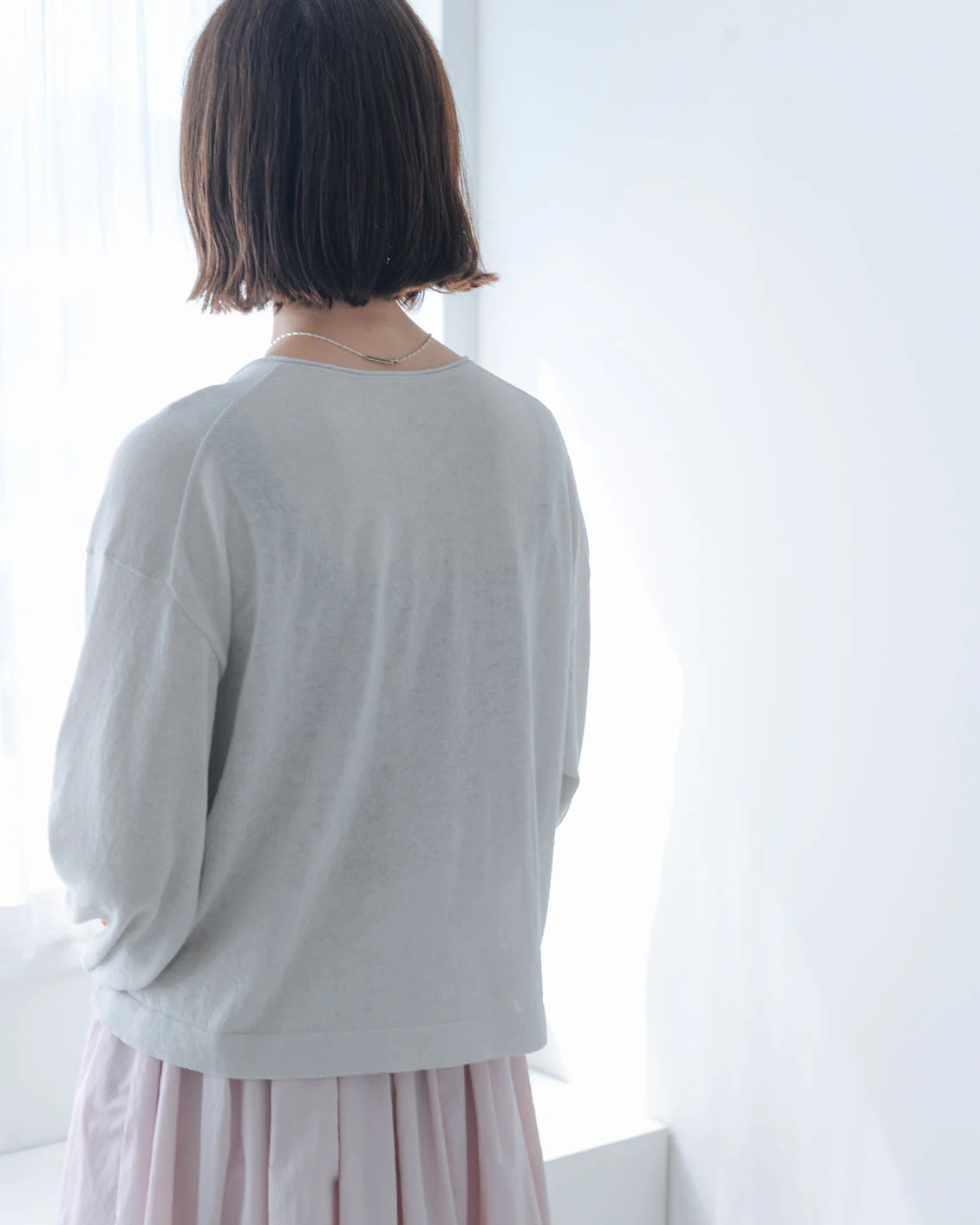 前ボタンを閉めて、プルオーバーのように着るのも可愛いなと思いました。生地が薄手なので、ボトムスインも問題なくできます」