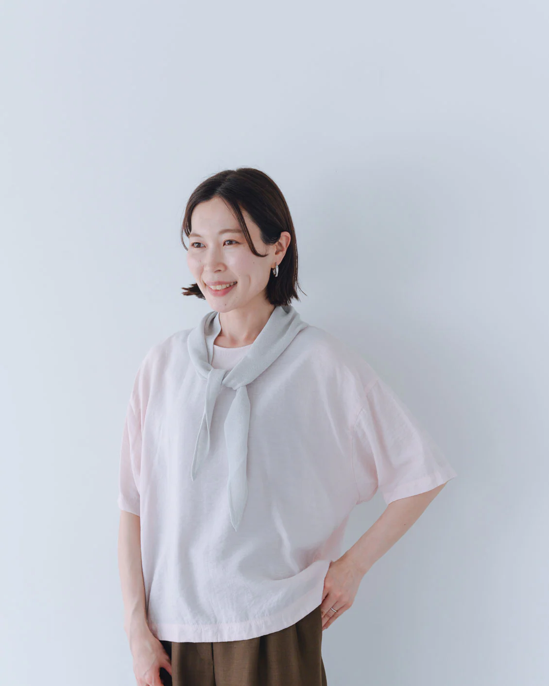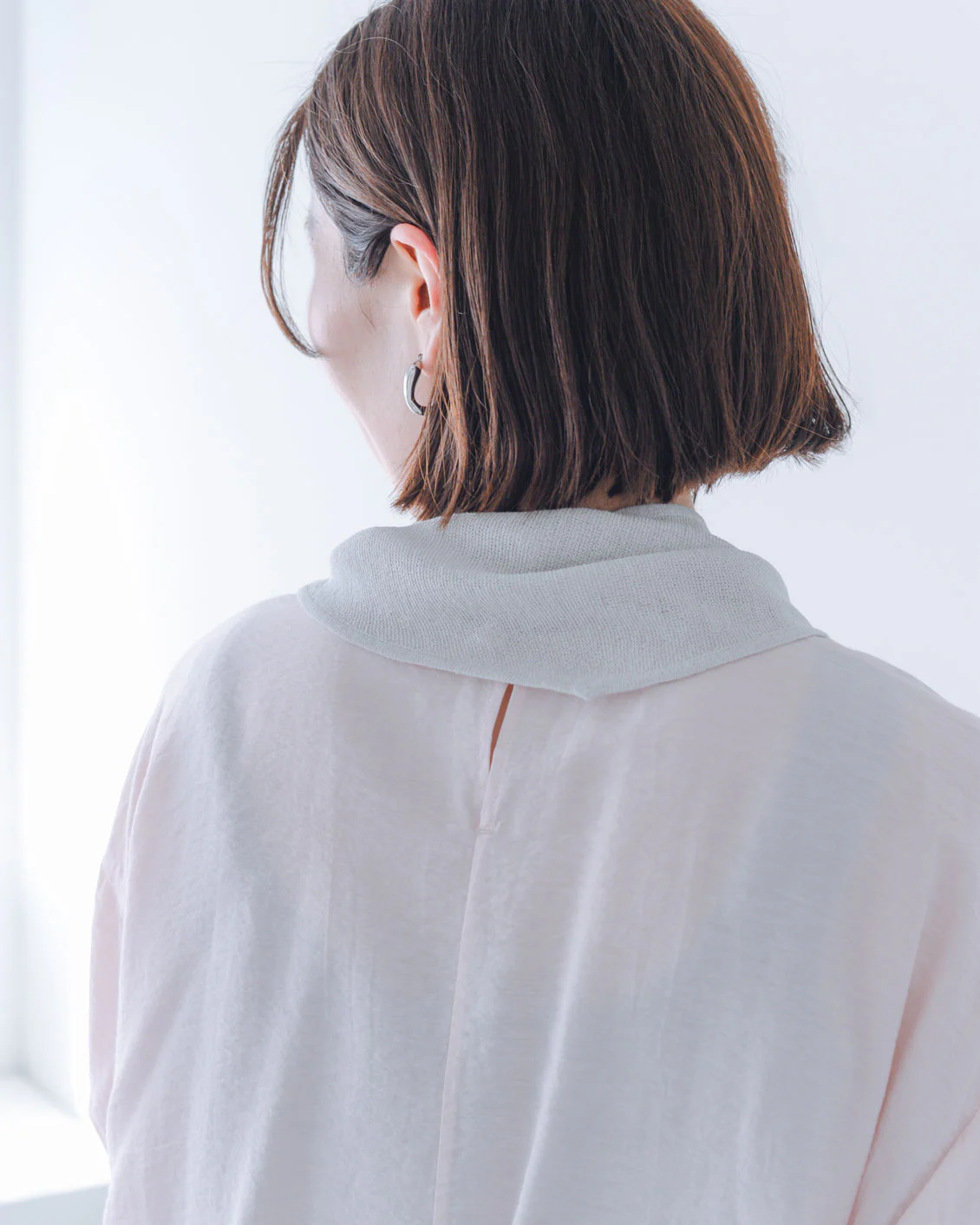 「スカーフだけでも使い勝手が良さそう。私のように髪が短いと、首の後ろはどうしても日焼けしがちで。このスカーフなら、さっと首にかけるだけで守れるのが助かりますね。