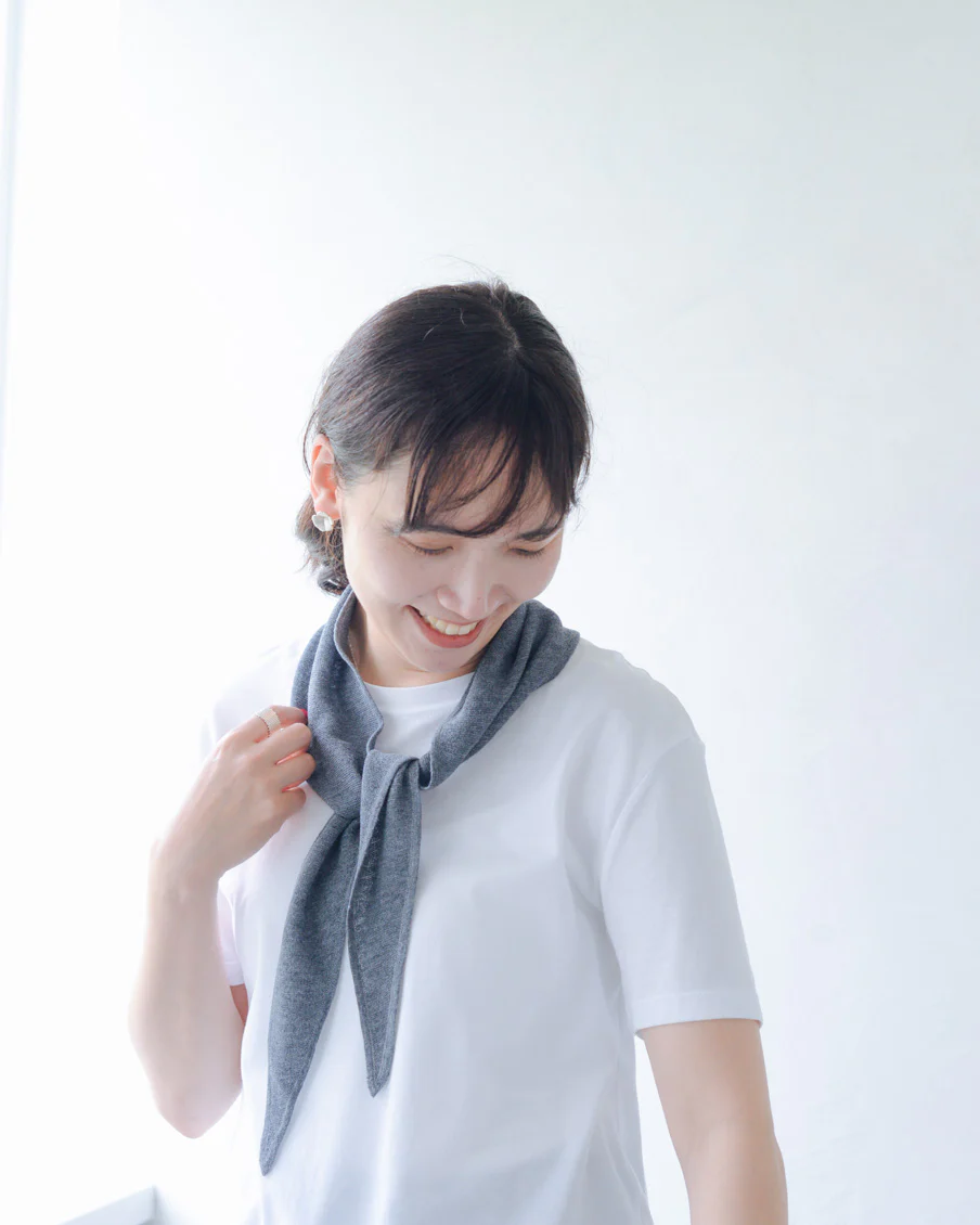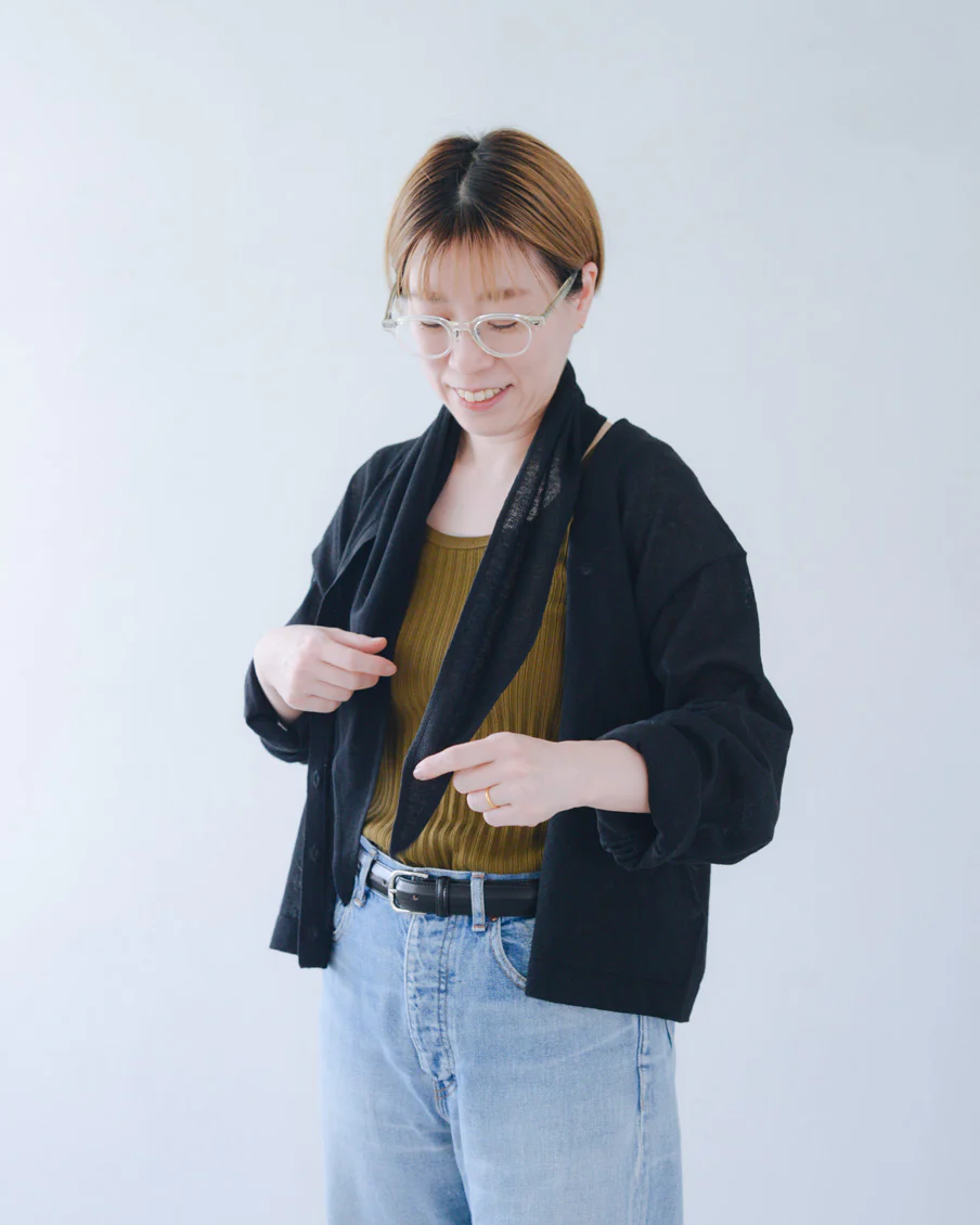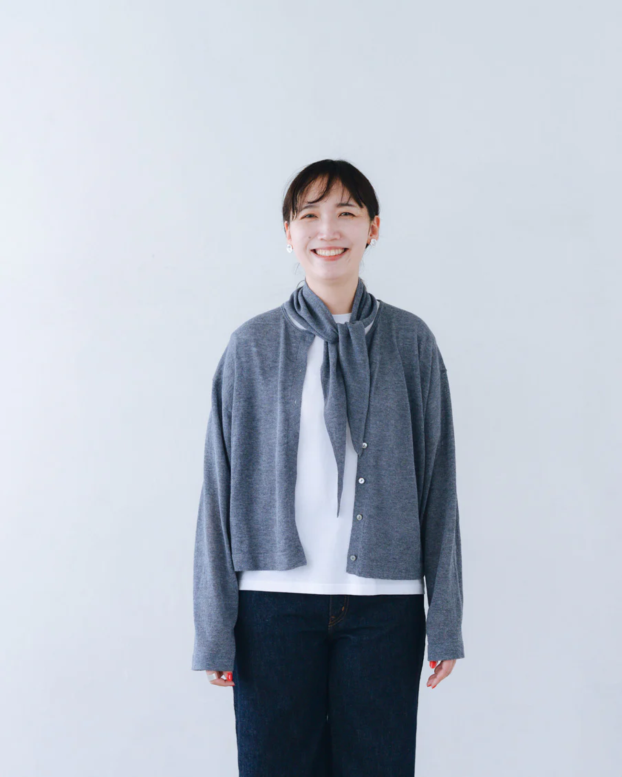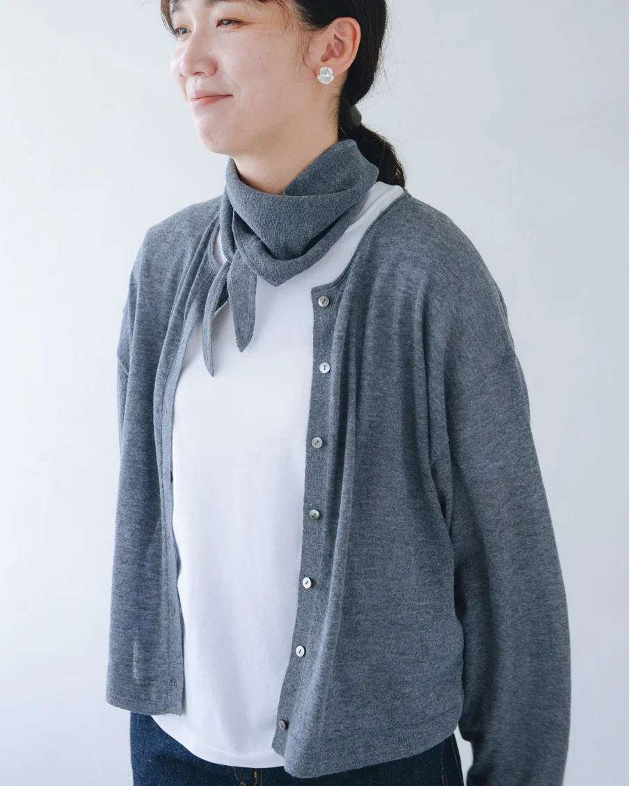 「スカーフはカーディガンと合わせてニュアンスが出るよう、本体とは違うガーター編みにしていて、肌離れもいいんですよ。勿論カーディガンなしで、お手持ちのTシャツなどに合わせていただいても。