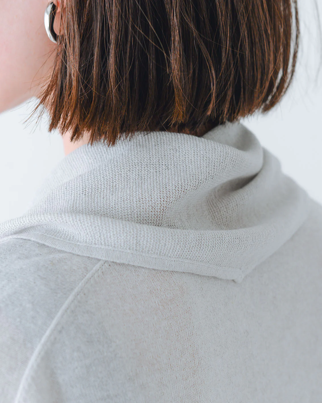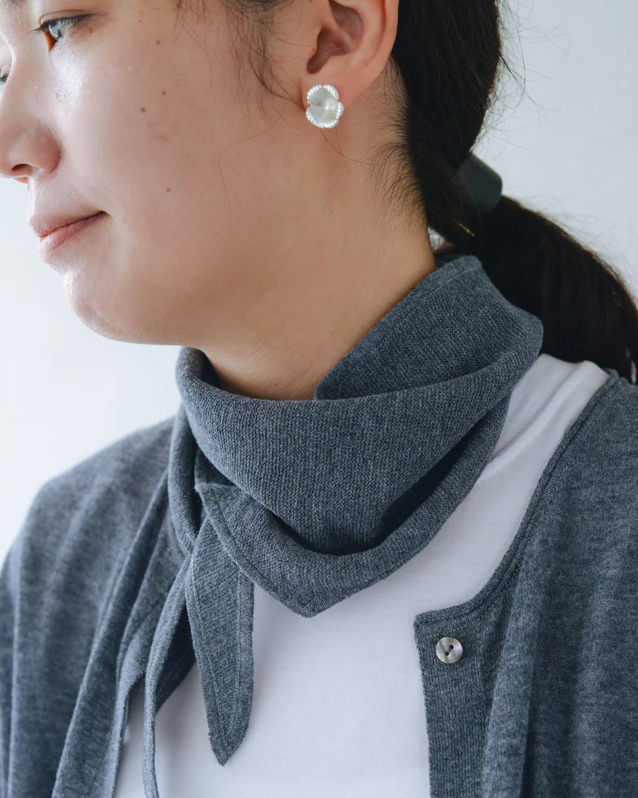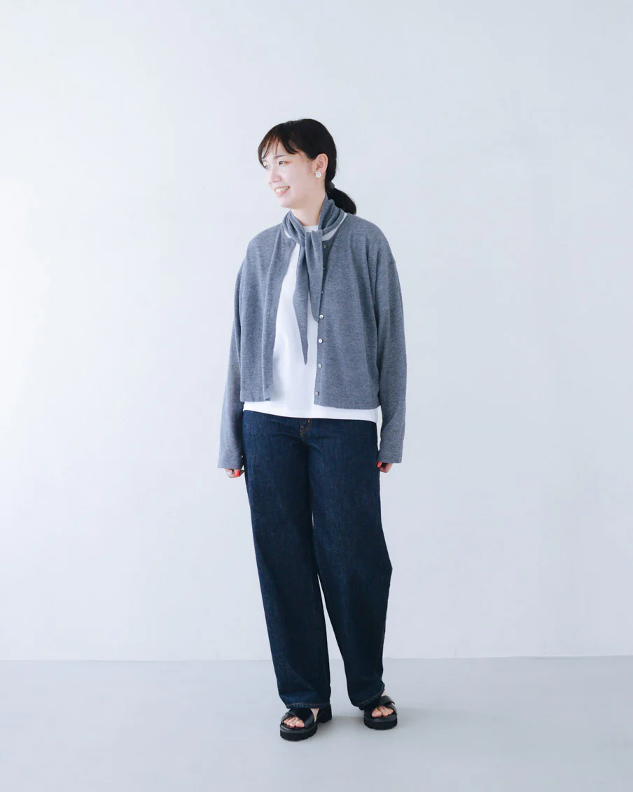 「スカーフはカーディガンと合わせてニュアンスが出るよう、本体とは違うガーター編みにしていて、肌離れもいいんですよ。勿論カーディガンなしで、お手持ちのTシャツなどに合わせていただいても。