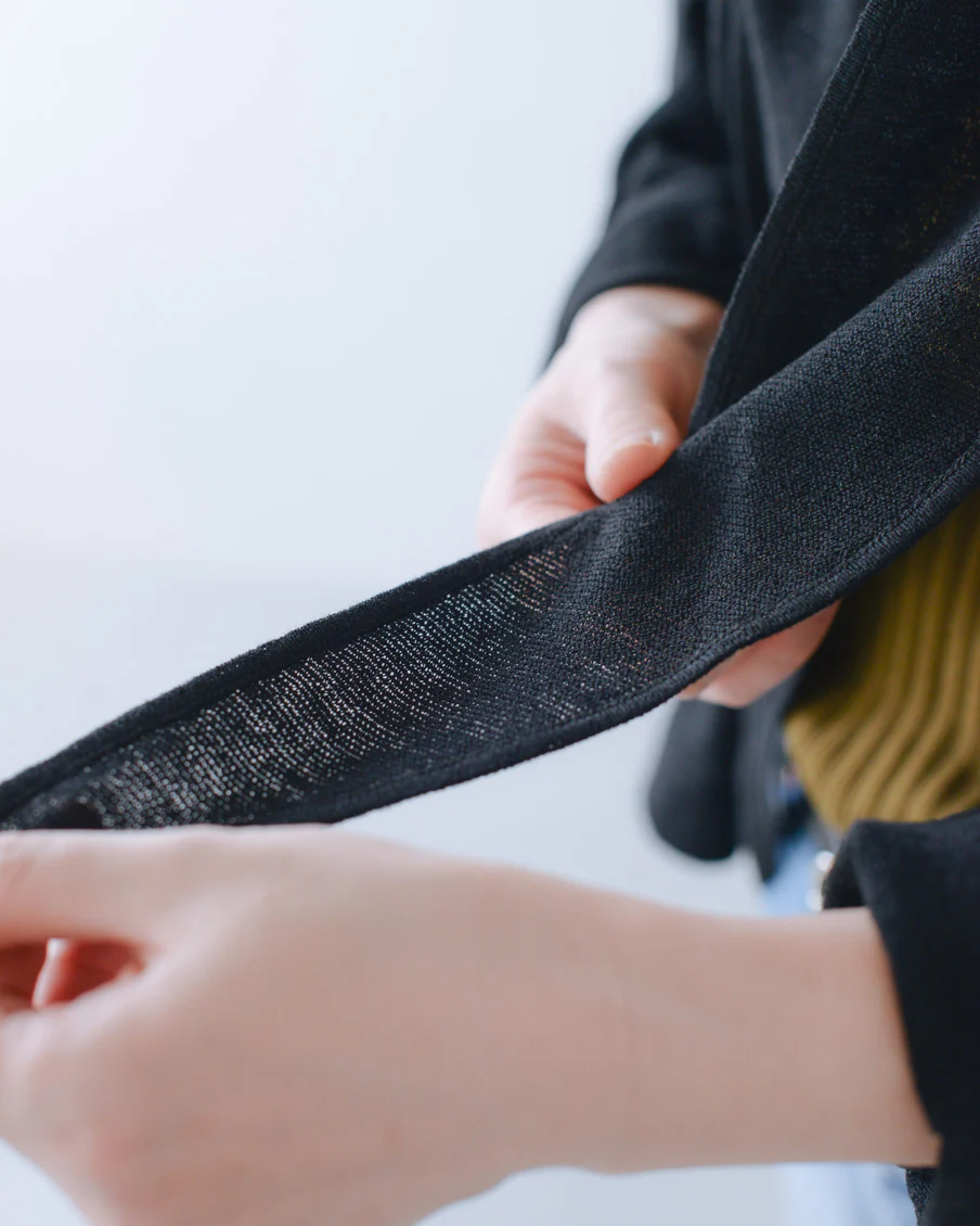 ジグザグとした編み目のおかげか、カーディガン本体よりさらに肌離れが良く、汗で蒸れたりもしにくそう。