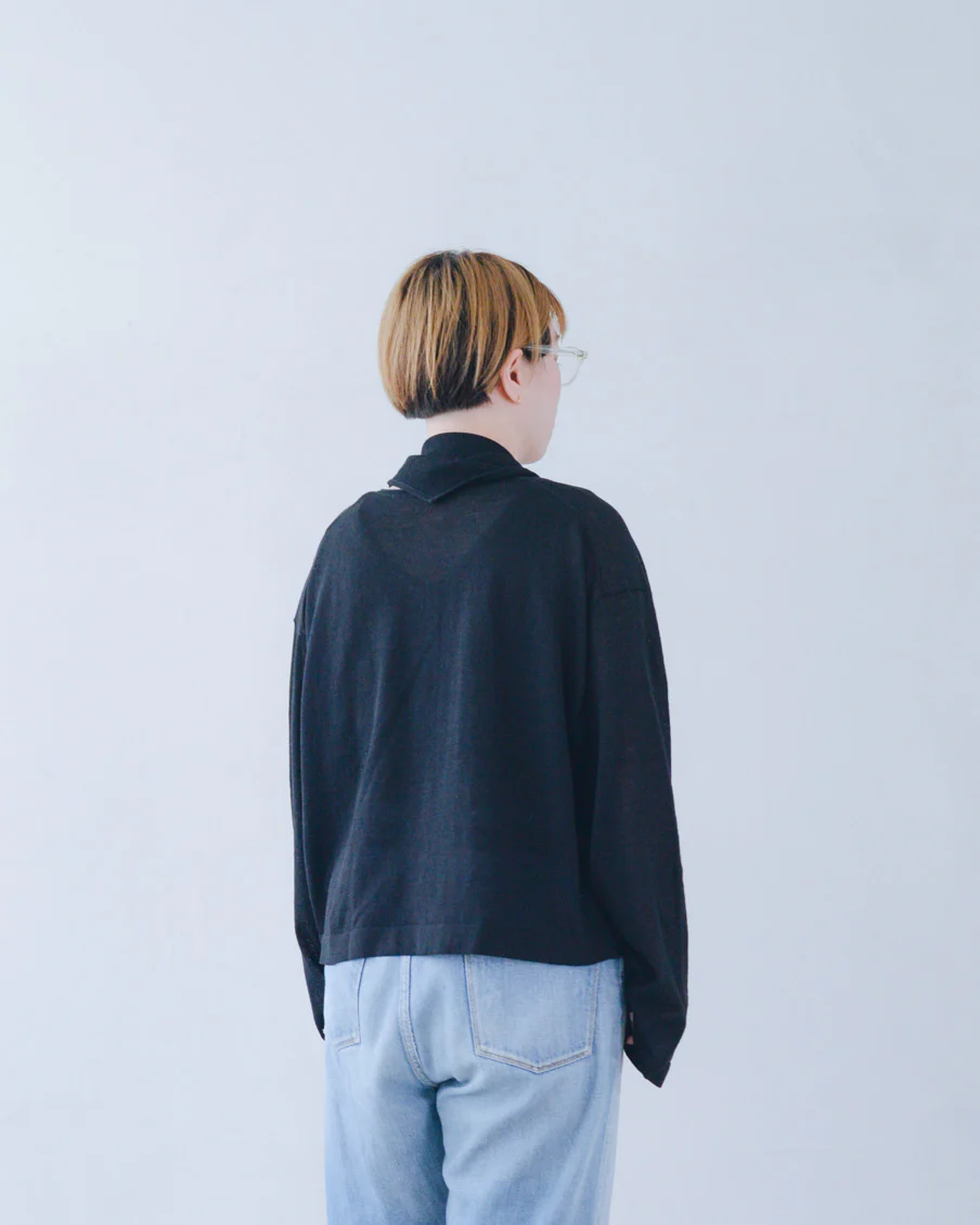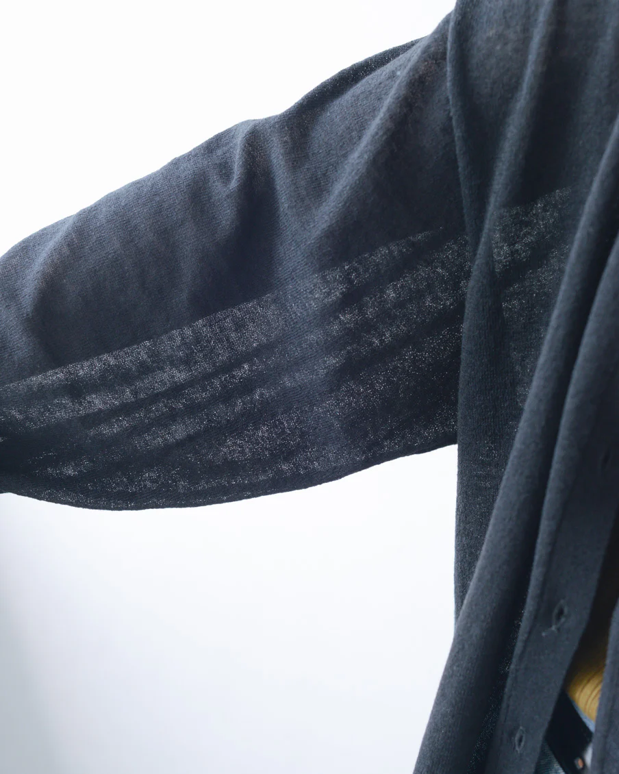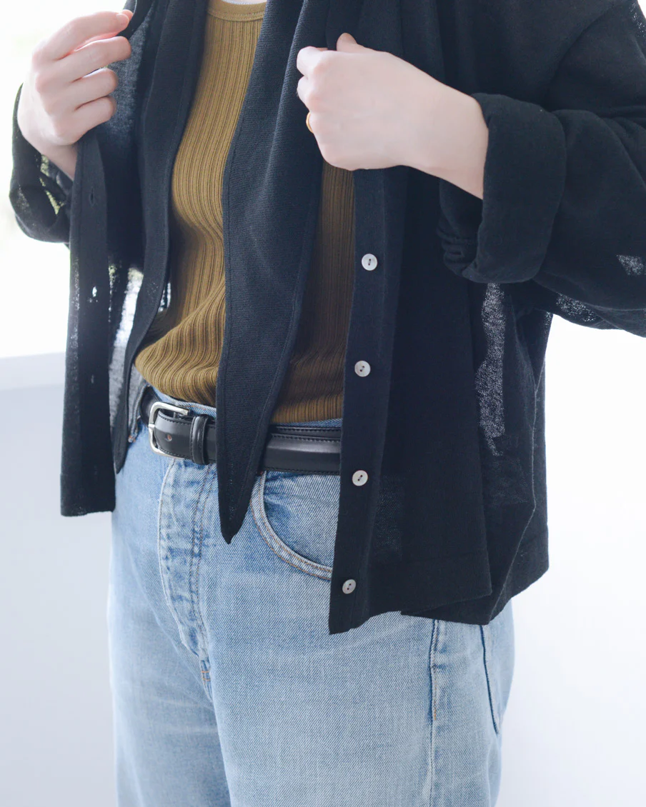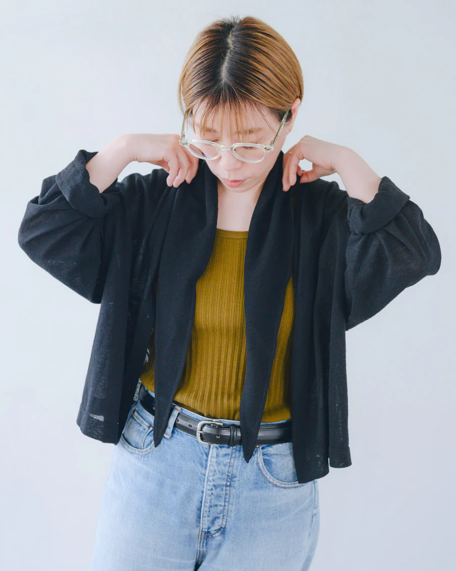 薄手の生地ですがペラペラではなく、自然な透け感という感じ。これなら黒でも軽やかなので、夏服にもすっと馴染みそう。 室内での冷房よけにも、日差しが気になる外でも、さらっと使える生地感だと思います。