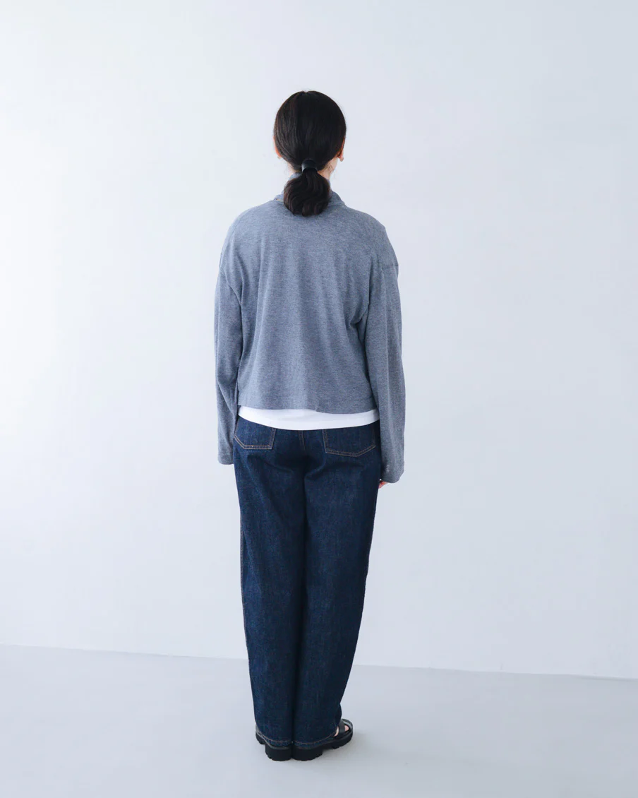 着丈は短めで、Tシャツの裾が少し見えるくらいのコンパクトさ。袖丈は指先が出るくらいとやや長め。身幅やアームホールにもゆとりがあり、Tシャツの上から着ても、形に響きません。