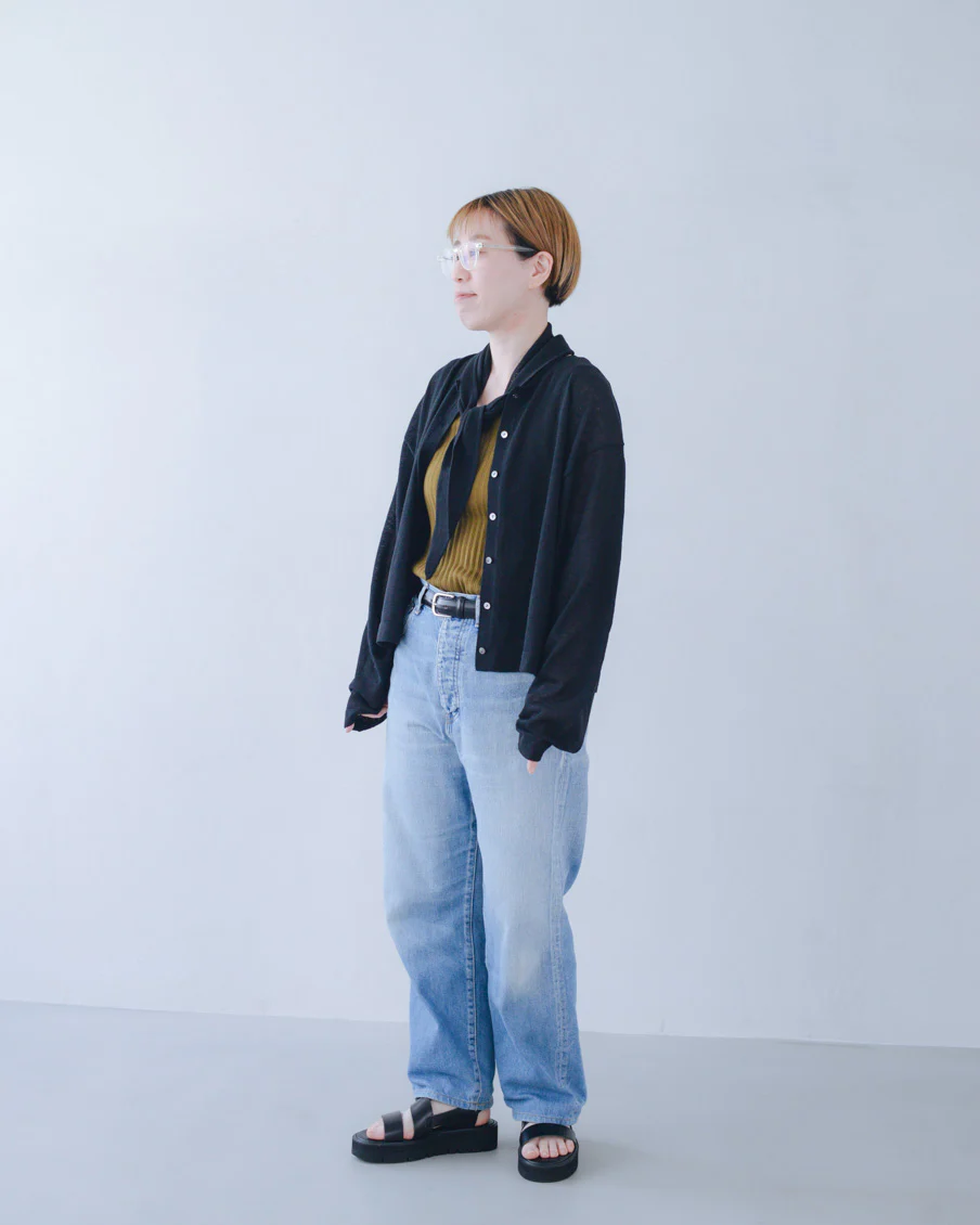 ボタンの留め方次第で、カーディガンのようにも、クロップド丈のトップスのような雰囲気にもなるので、いろいろな着こなしが楽しめますよ」