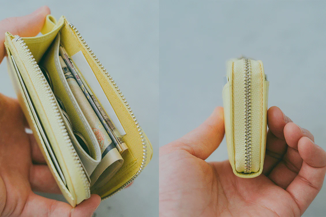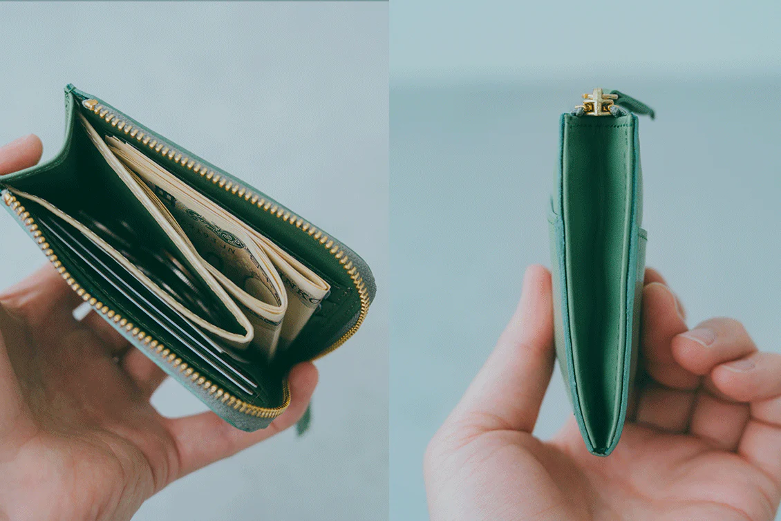 左……「必要なだけ、ぴったり収納」L字ファスナーのコンパクト財布