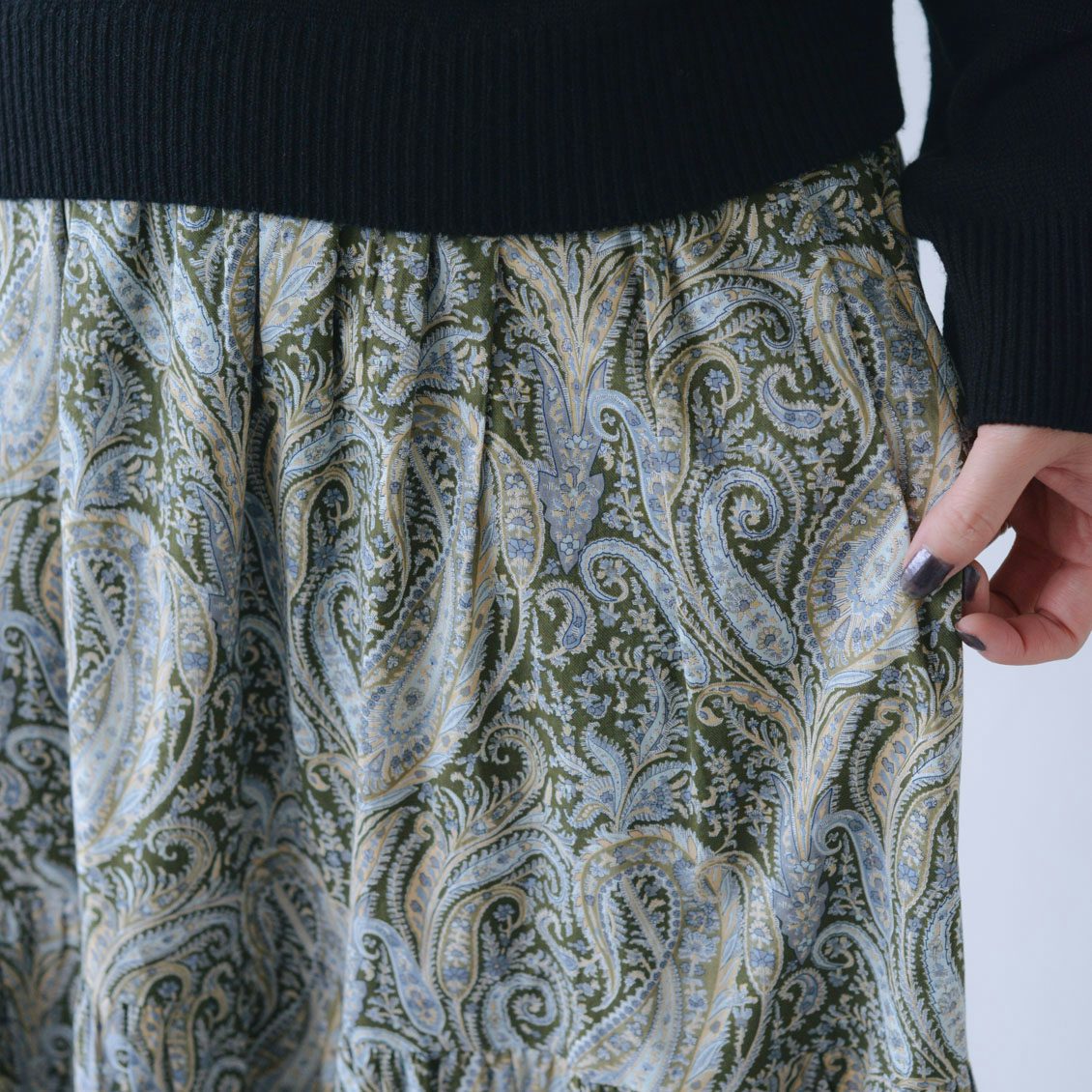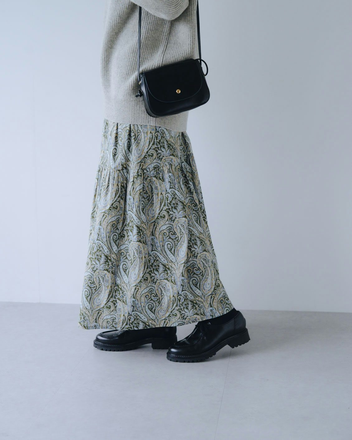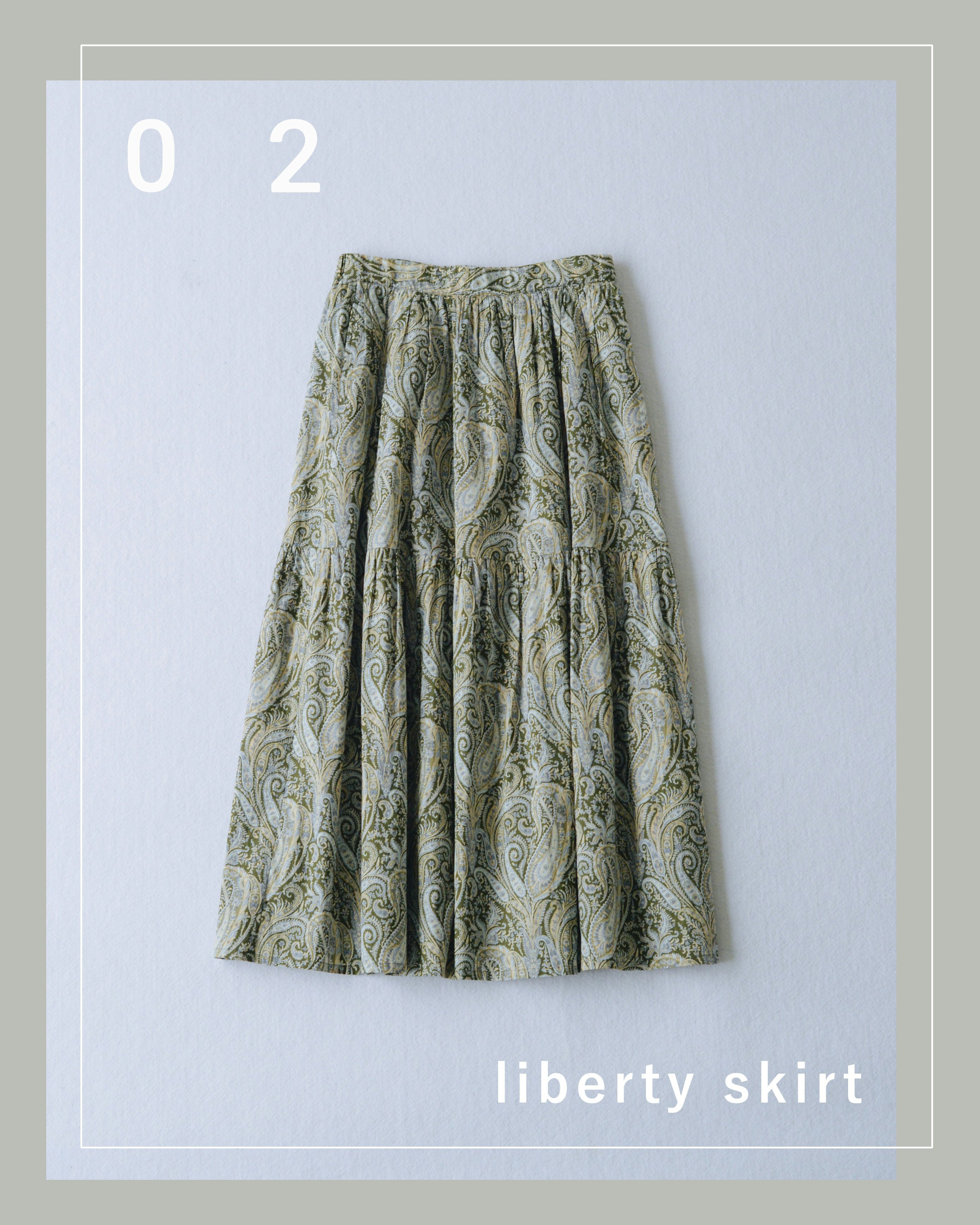 華やかで繊細なリバティプリントを贅沢に使った、シックに着られる大人のための柄スカートです。シンプルなトップスに合わせるだけでおしゃれが決まります。