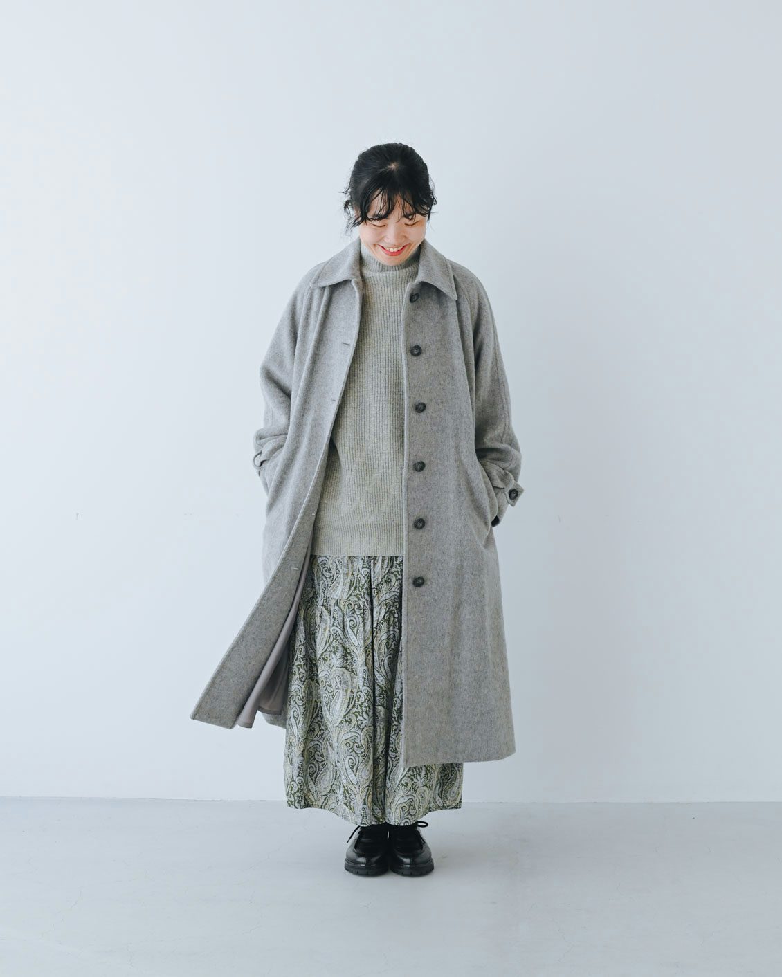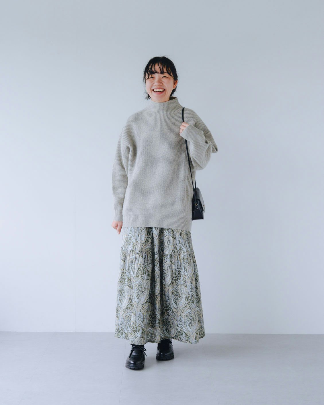 「こちらのスカートも発売時から愛用しています。秋冬はワントーンコーデを楽しみたいなと思い、遠目で見るとグレーっぽく見えるスカートの色に合わせて、グレーのニットを合わせてみました。
