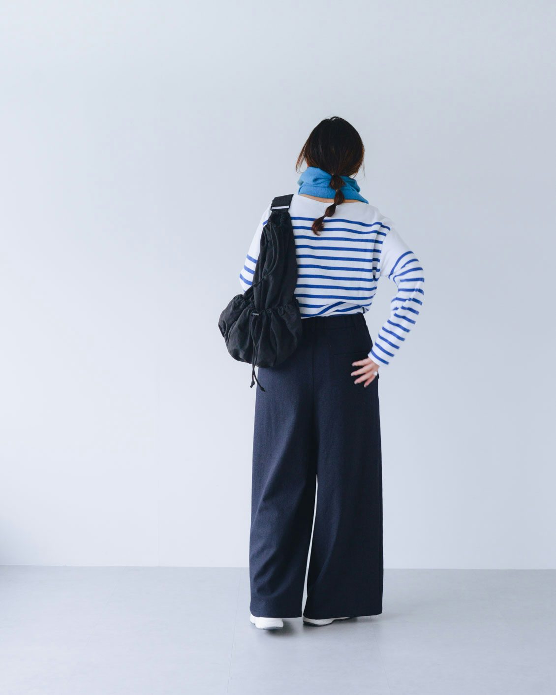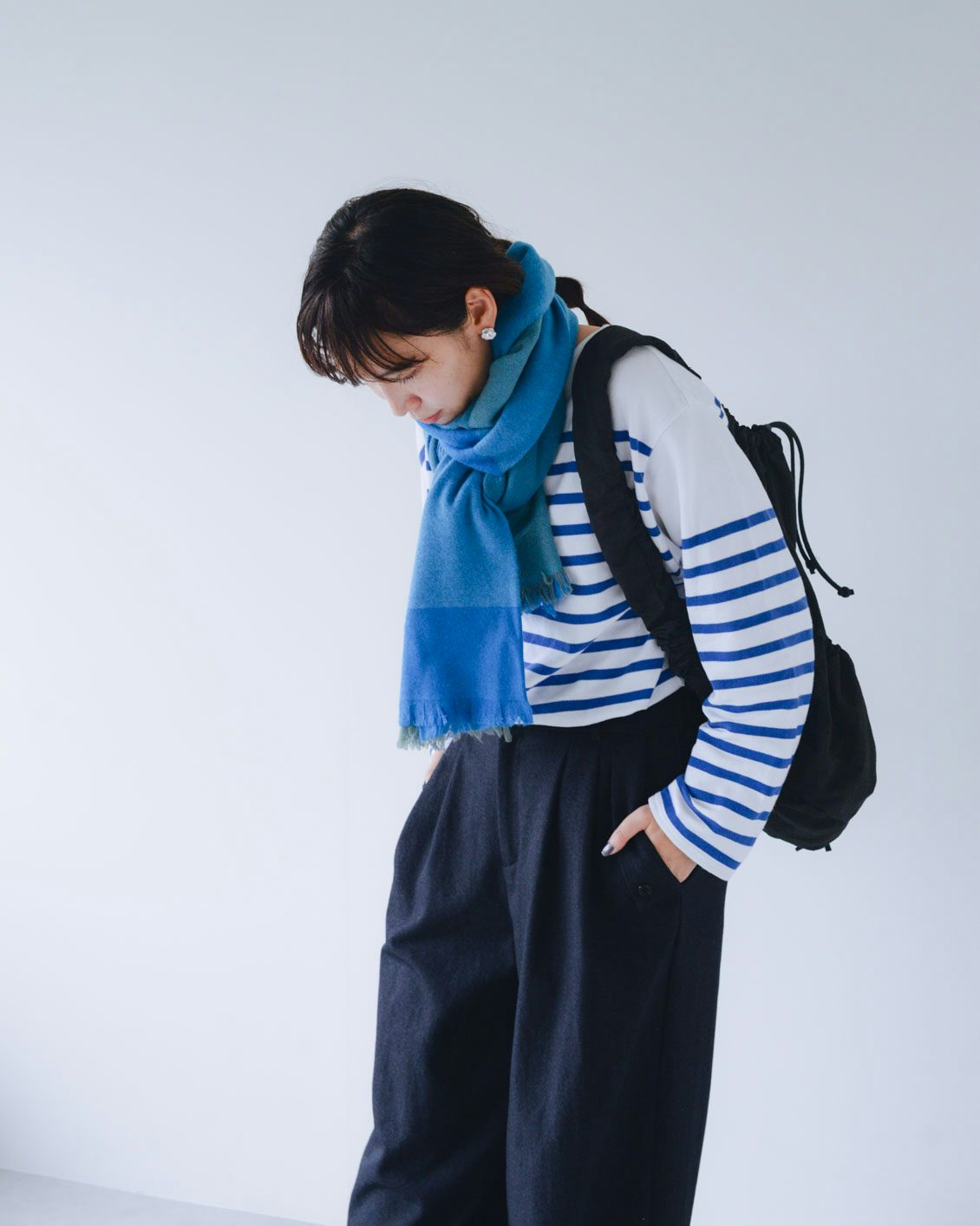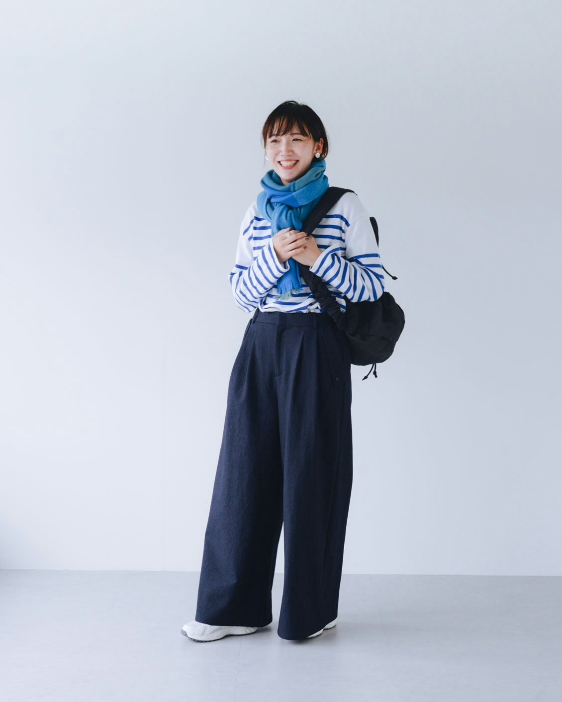 ダボっとしすぎず、ストンと落ちる形なので、こういったボーダーと合わせてもカジュアルになりすぎないんです。とはいえきれいめすぎることもなく、普段の服装にも合わせやすい。