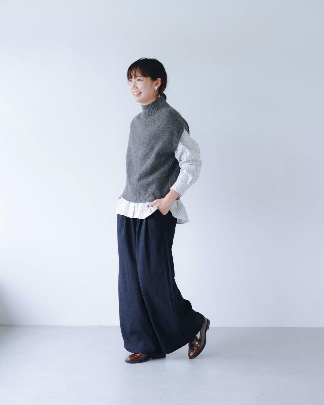 「もう1コーデ、シャツ+ニットベストを合わせてみました。