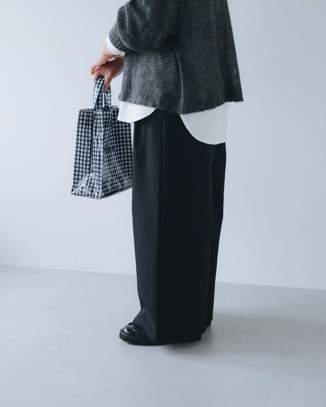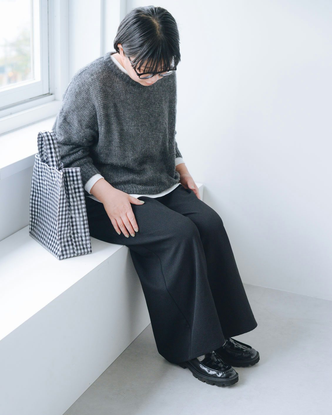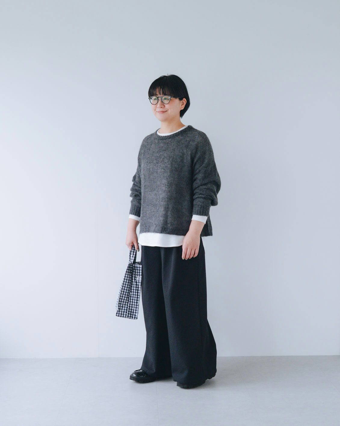 「ブラックを着てみました。今回はグレーのざっくりニットを合わせましたが、パンツにボリュームがあるのでコンパクトなトップスを合わせても良さそうですね。
