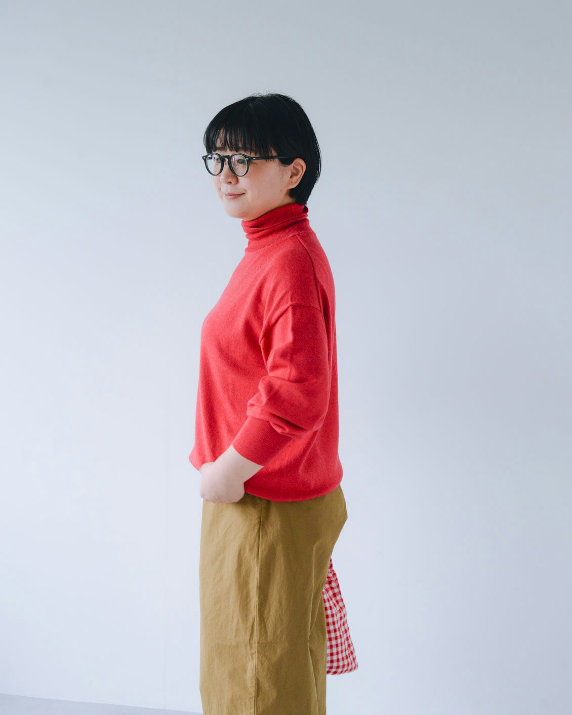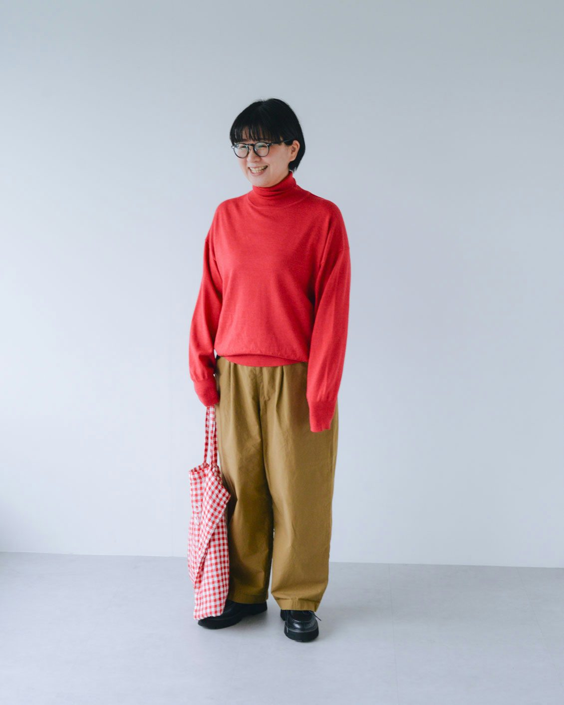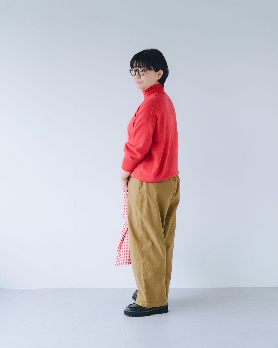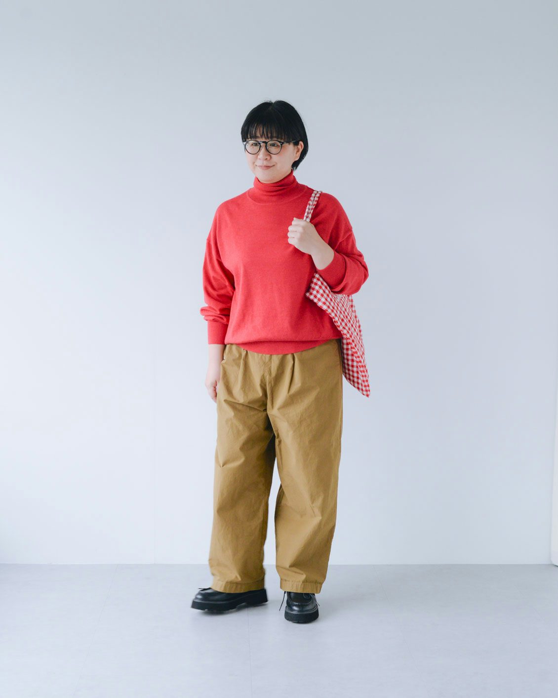 でもこのポピーレッドは少しピンクっぽさを感じるからか、肌の色から浮かない感じがして着やすいです。手持ちのカーキのパンツと合わせてみたらぴったりでした」