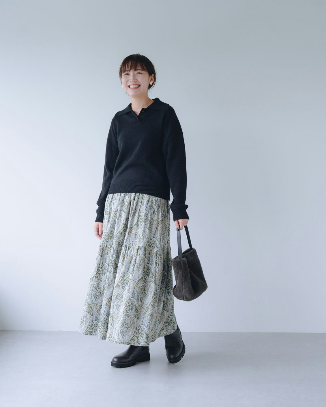 秋冬はやはりニットに合わせたいなと思ったのと、今までアイボリーやグレーなど明るい色を合わせることが多かったので、今回はブラックの襟付きニットに着てみました。