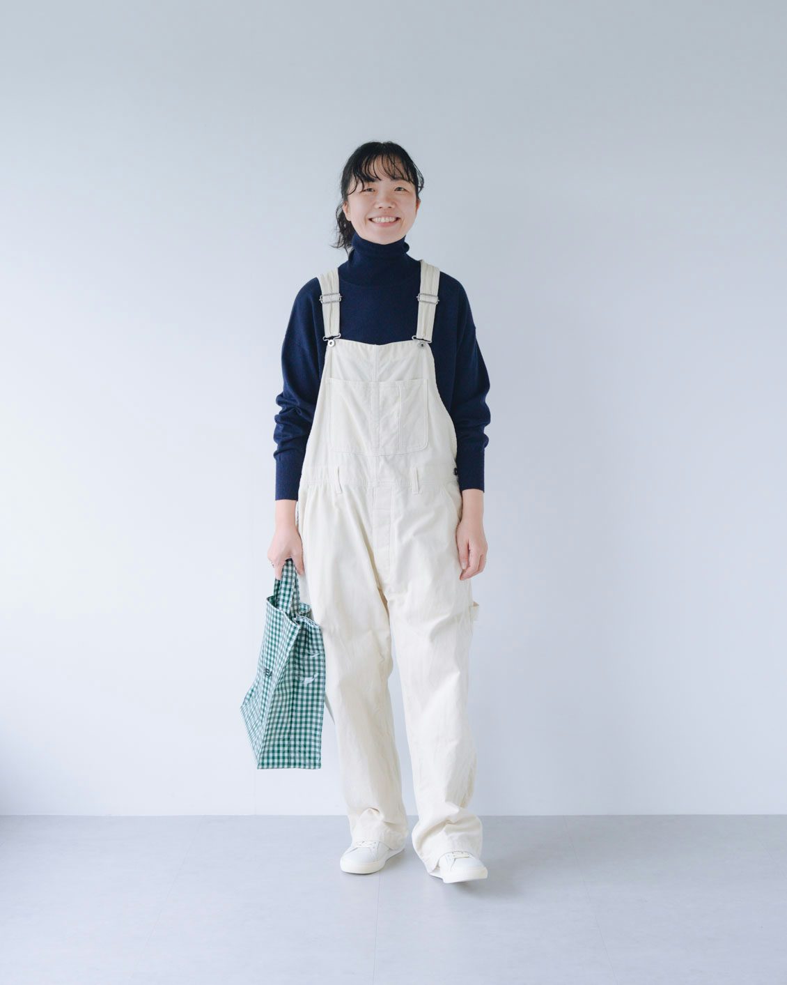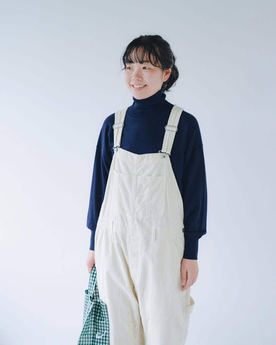 「薄手でかさばらないので、こういったサロペットやベストのインナーとしても便利なんですよね。