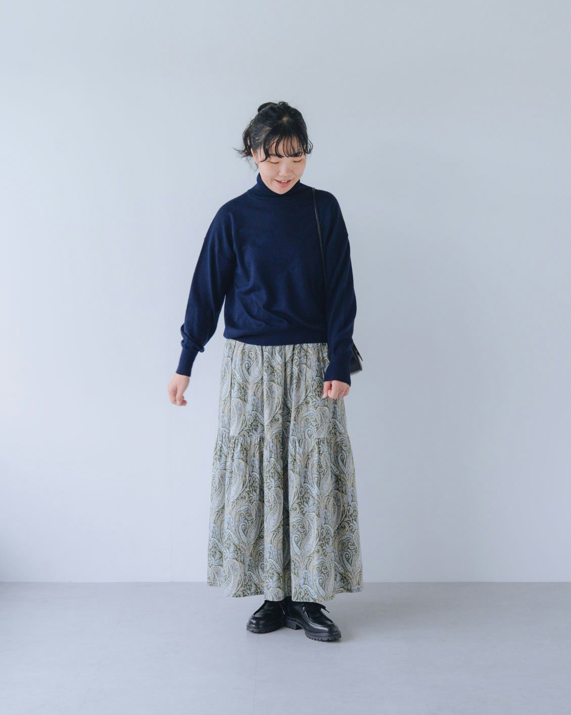 「最初に登場したハイネックニットのグレー+リバティスカートのコーデも去年実際に着ていました。