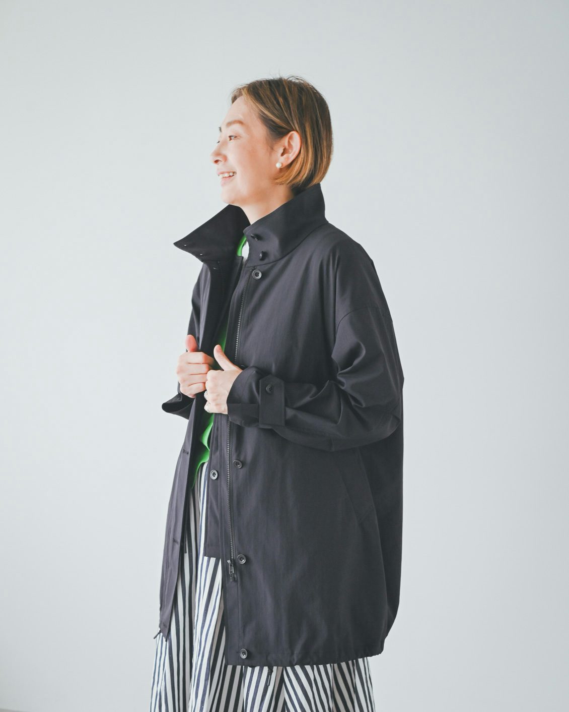 「体にピタッとせず、程よくふわっと広がるシルエットが着やすく、体型も自然にカバーしてくれます。後ろのさりげないボタンも、良いアクセントになってくれていますね」