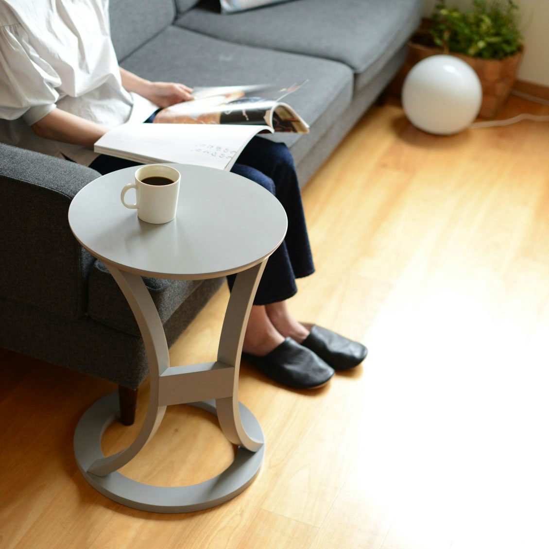 サイドテーブルはソファやベッド脇で使えるおしゃれなものがいい。今回ご紹介するのは、木目がナチュラルで、シンプルな形のかわいいサイドテーブル。ソファの脚や下部分に差し込みできるので、自分に引き寄せて使えるし、使わないときにソファ側にシュッと引き込んでおけば省スペースです。スリムな丸テーブルは、直径40cmとPCを広げられるのがうれしいですね。