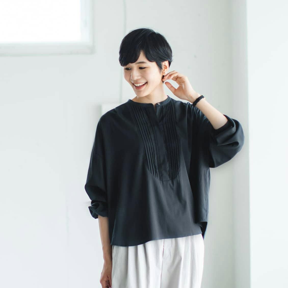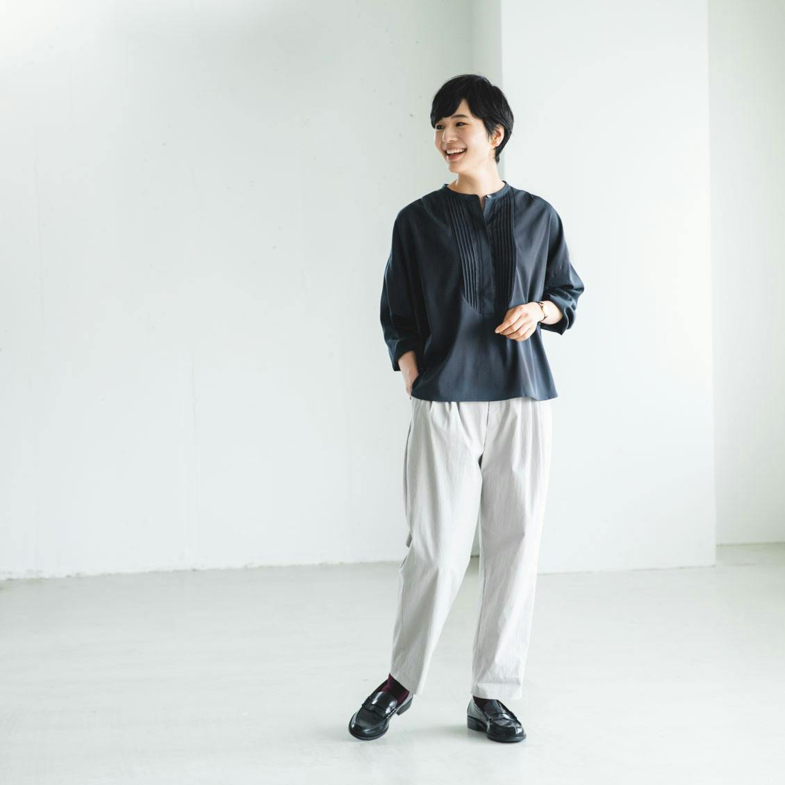 着こなしによって、晩夏から秋本番の寒い時期までさまざまに楽しめるブラウスをつくりました。