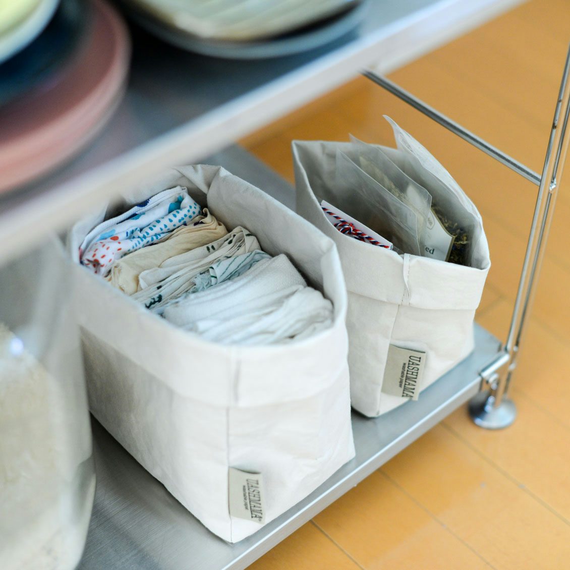 ▲キッチンで使うなら、Mは布巾入れに、Sは茶葉のストック入れに