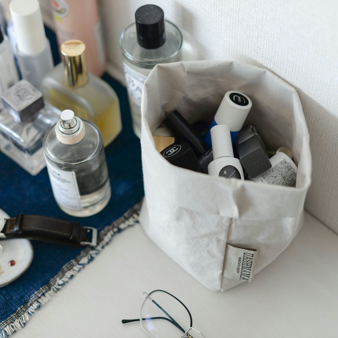 洗えるくらい水に強いならば、洗面所脇でスキンケアアイテムをひとまとめにしたり、観葉植物の鉢カバーにするのもよさそう。使い道がどんどん浮かび、使い勝手のよさそうなSサイズも追加で買うことにしました。