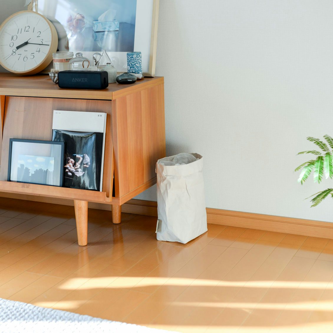 Mサイズは横17cm、高さ30cm(折り返さない状態で)、マチ11cmほどあり、10リットルのゴミ袋を入れるのにちょうどいいサイズ。小さすぎず大きすぎない。色も、オフホワイトといえど柔らかなグレージュのような雰囲気で、家具にも壁にもすっと溶け込みます。