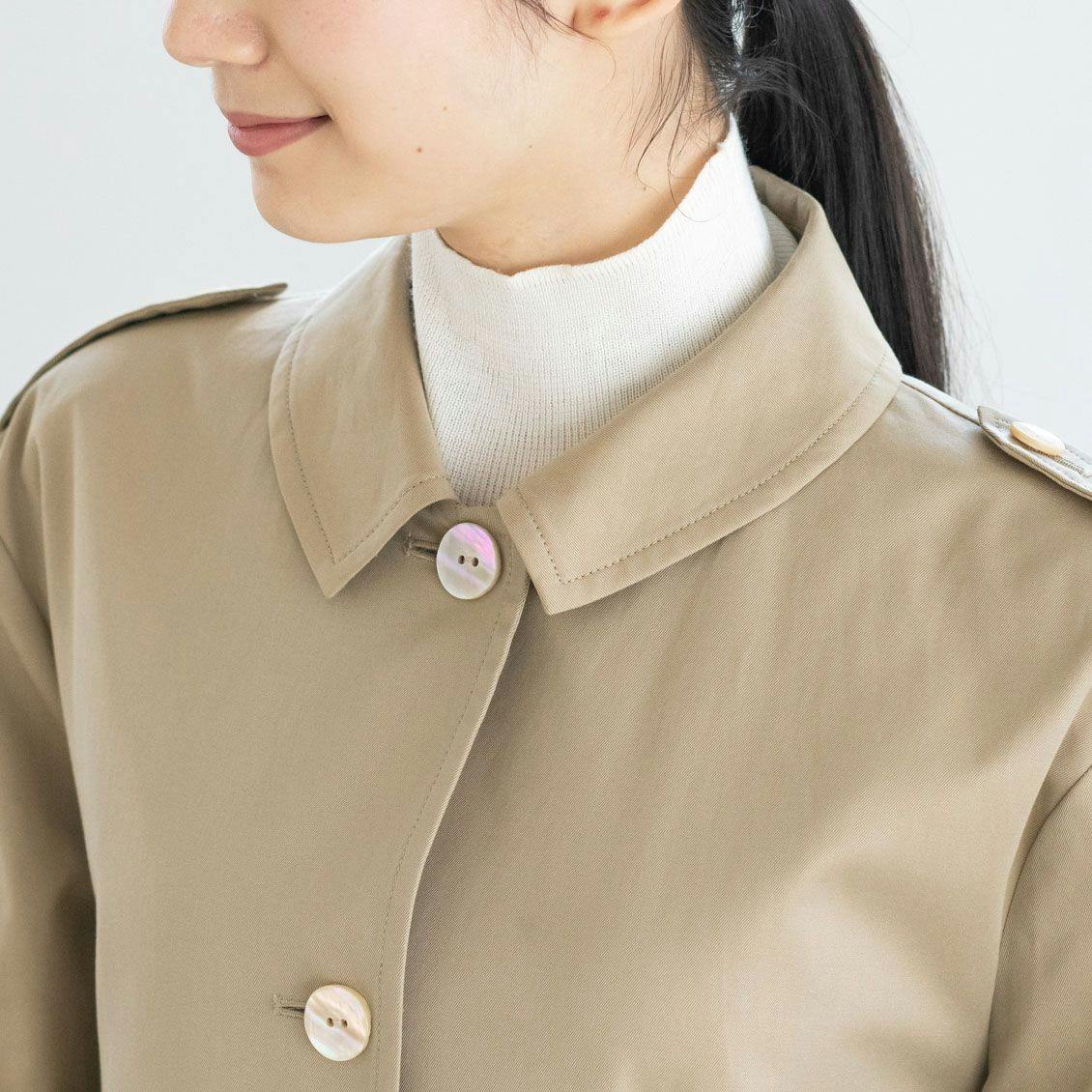 トレンチには珍しい、貝ボタンを使用。グリーンやピンクの儚いニュアンスカラーだから、一番上まで留めても柔らかな印象で可愛いですね。
